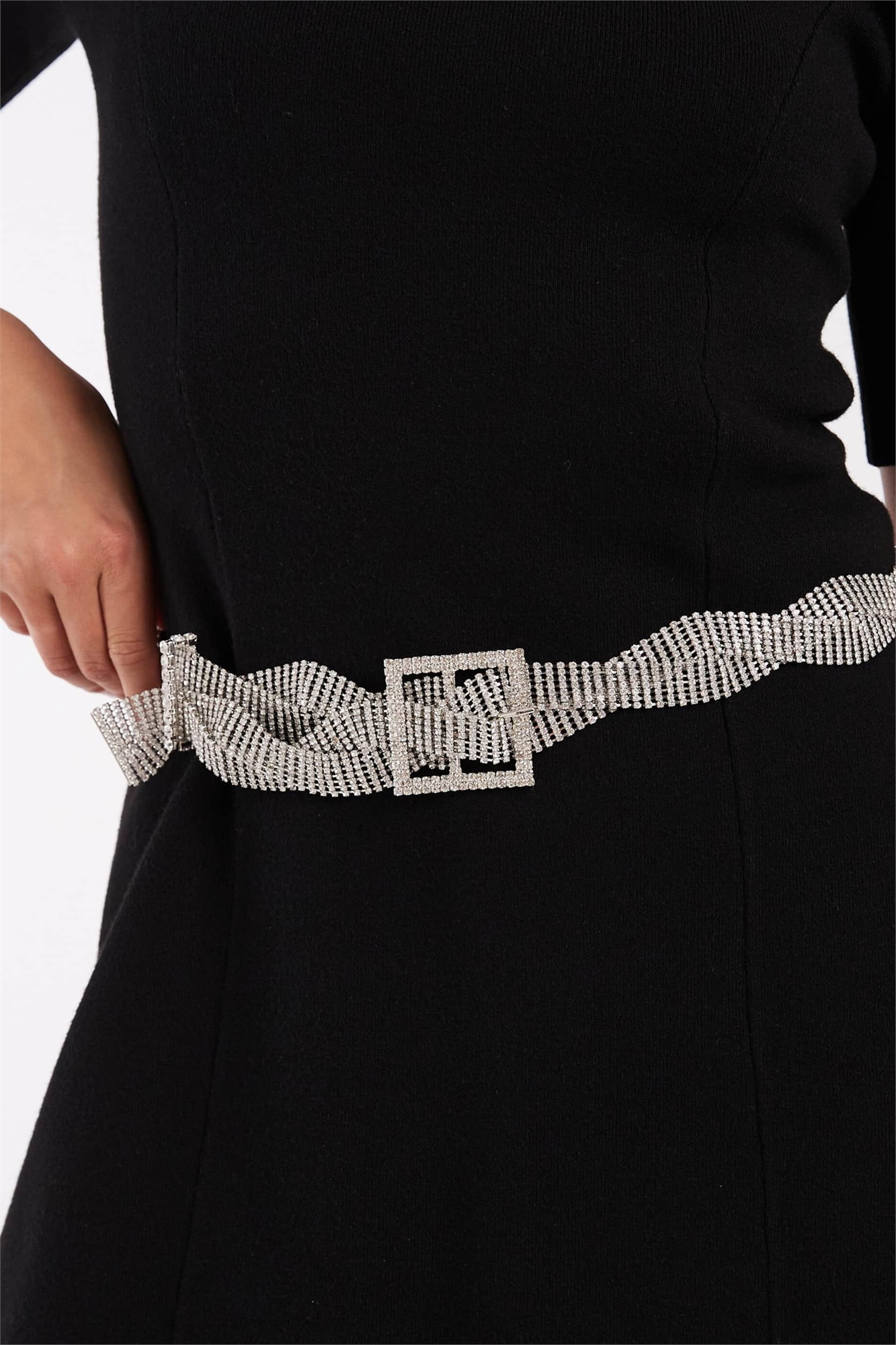 Пояс с кристаллами, закрученный в области талии и бедер, с квадратной пряжкой
