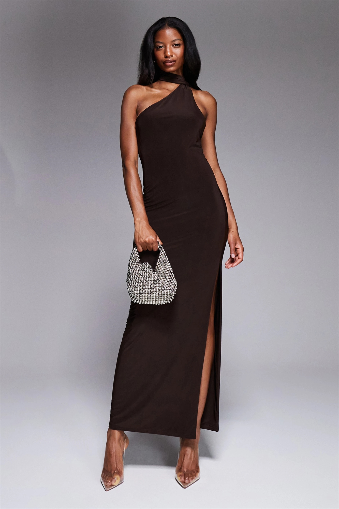 Эксклюзивное макси-платье с двойным слоем ткани и изящным шарфом на шее