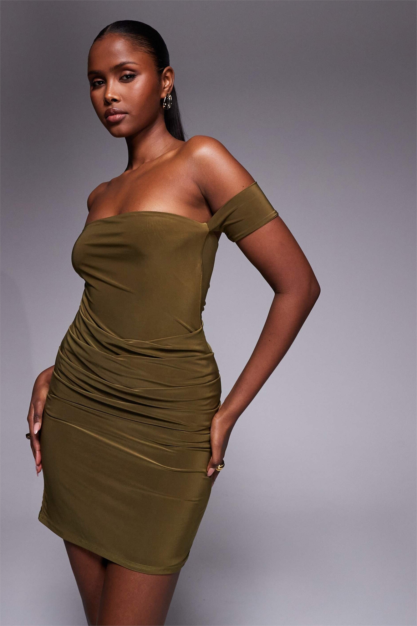 Эксклюзивное двухслойное облегающее мини-платье с открытыми плечами