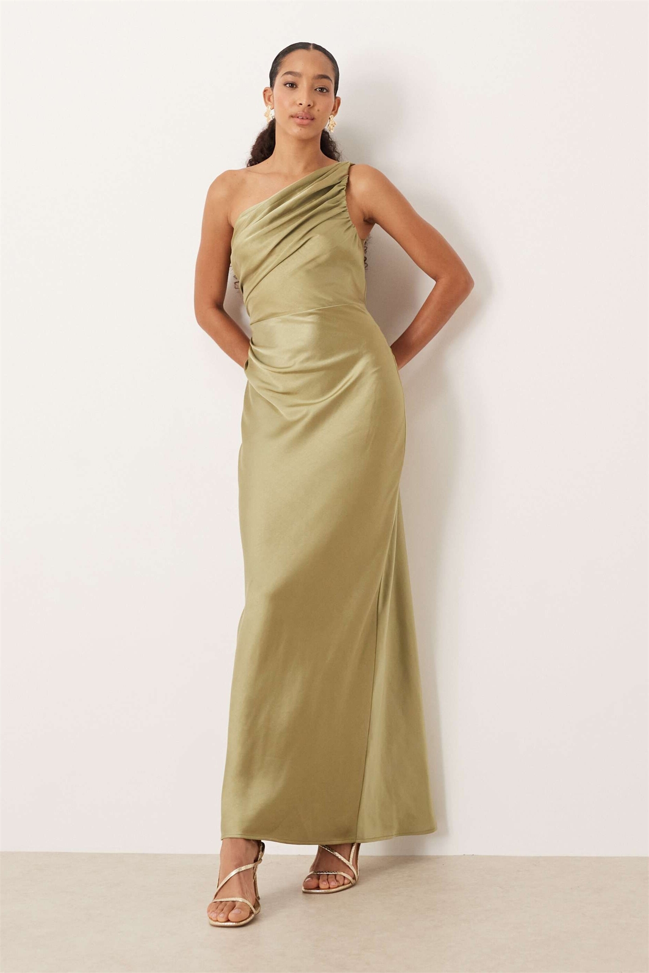 Макси-платье «Подружки невесты» от Juliet из атласа с сборками и одним плечом
