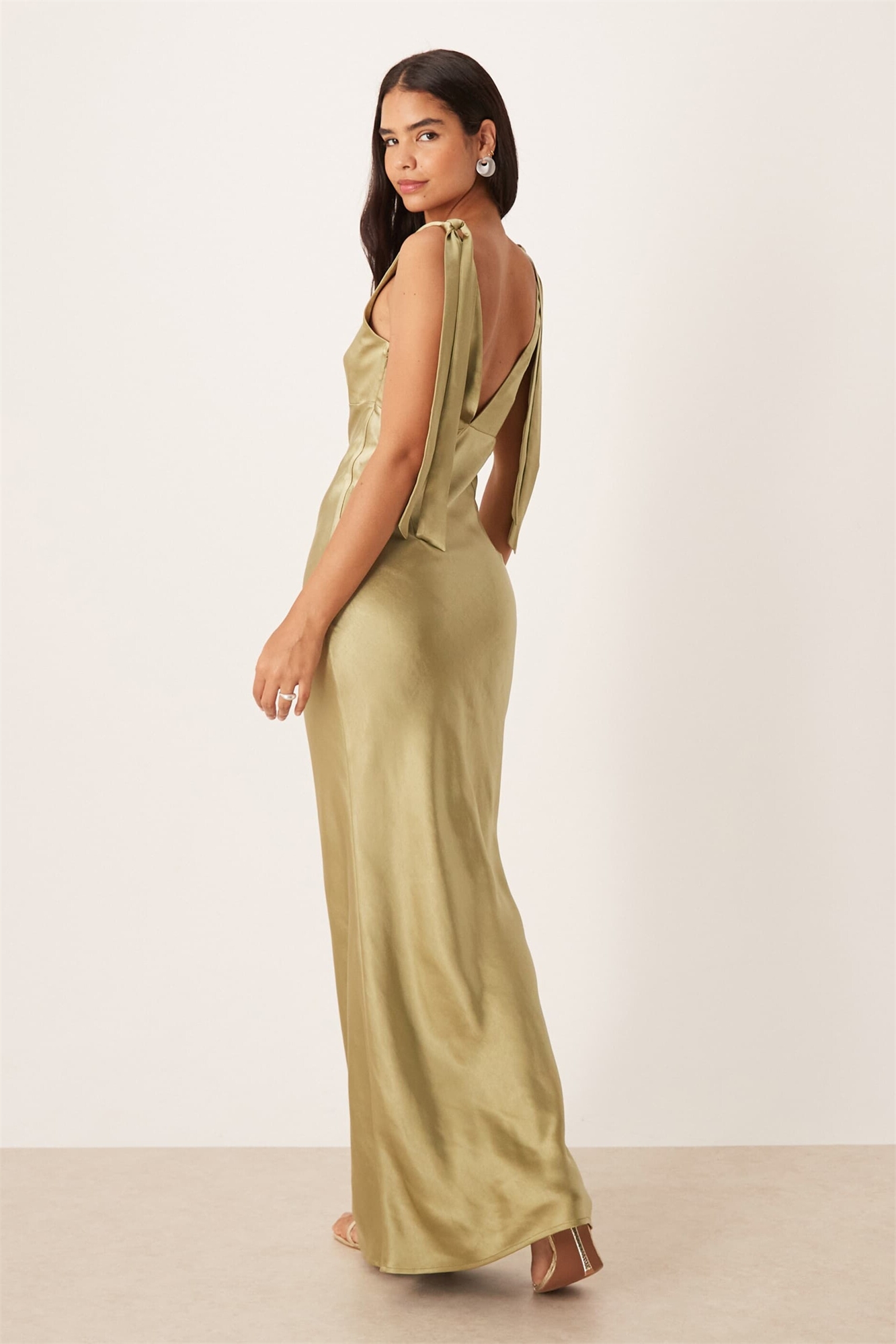 Макси-платье для подружки невесты от Piper с атласным бантом, открытыми плечами и V-образным вырезом