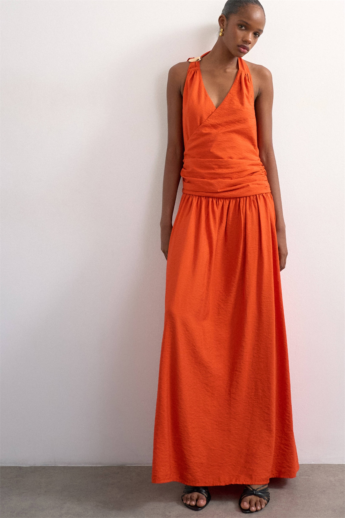 Макси-платье с глубоким вырезом на шее и шарфом, украшенное металлическими элементами