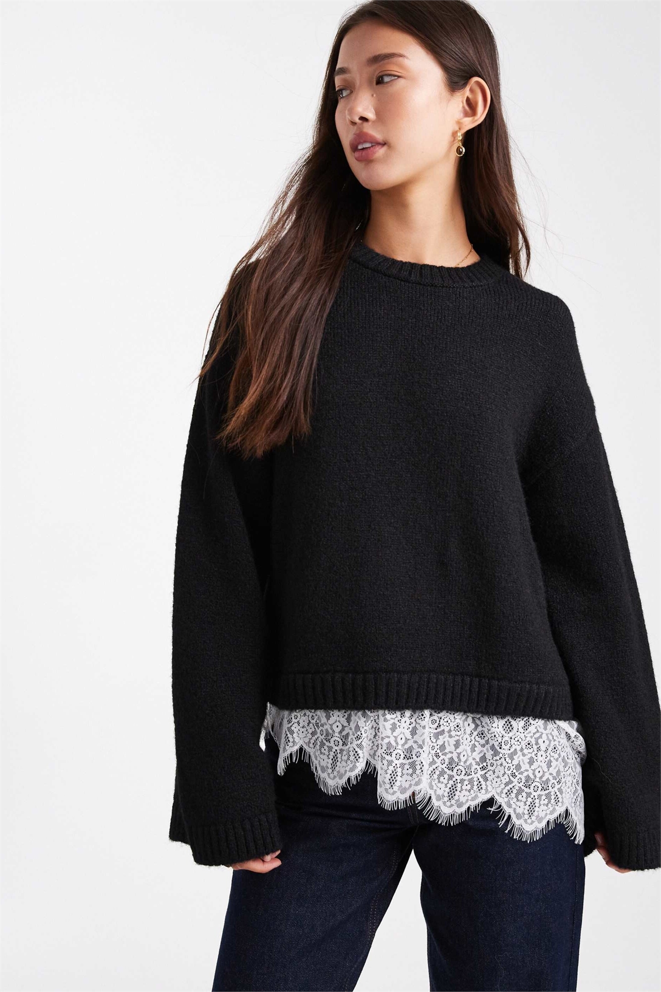 Свитер из трикотажа с пушистыми широкими рукавами и кружевным подолом