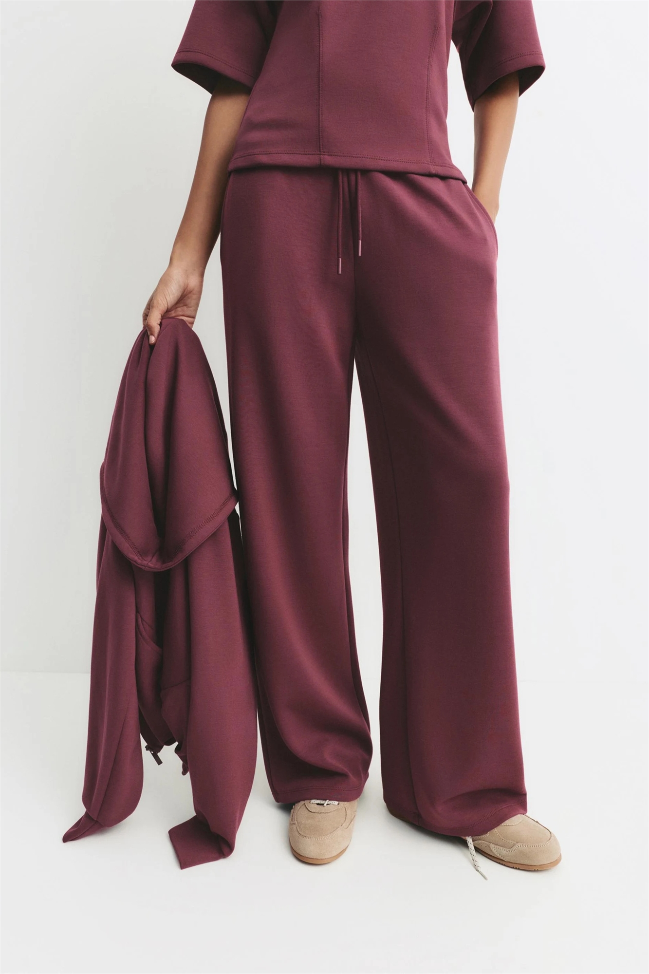 Ткань для толстовки: мягкая и тёплая, с уютной рельефной текстурой с внутренней стороны. Основной состав: 55% модал, 40% полиэстер, 5% эластан.