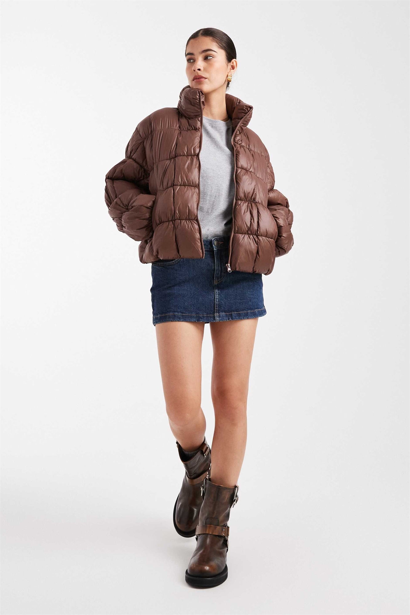 Блестящая стеганая куртка с рюшами на рукавах, коричневого цвета