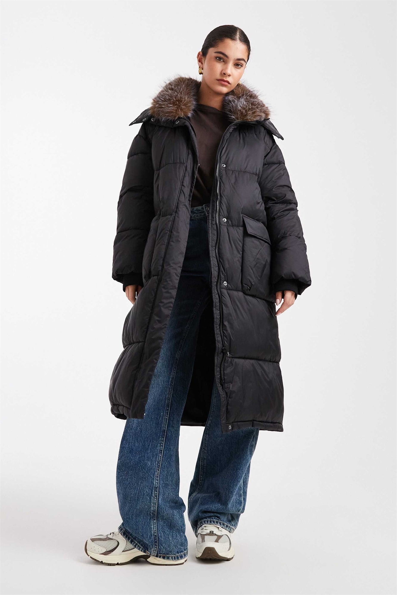 Длинное пальто с подкладкой и капюшоном на искусственном меху