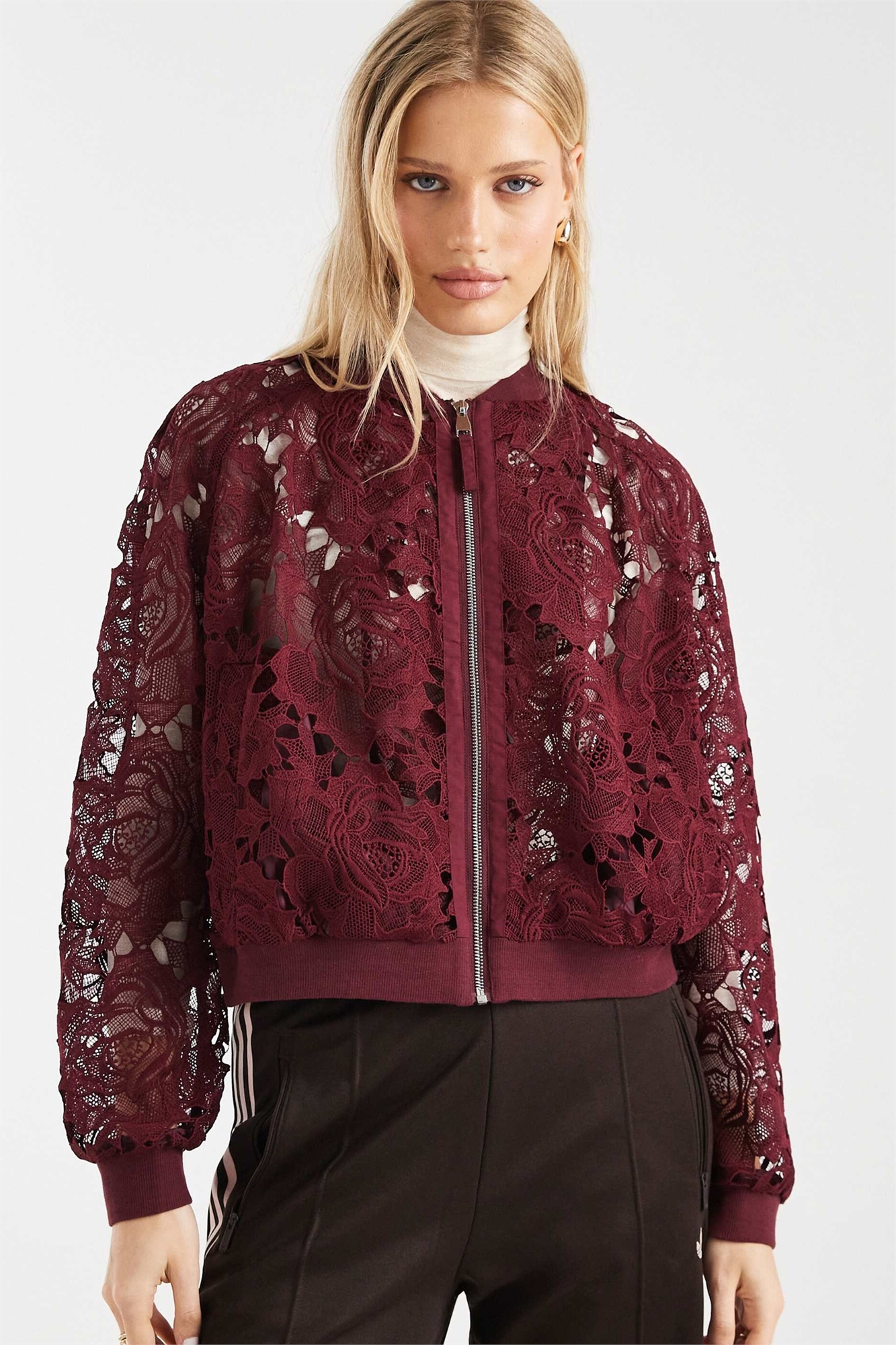 Кружевная бомбер-куртка вишневого цвета