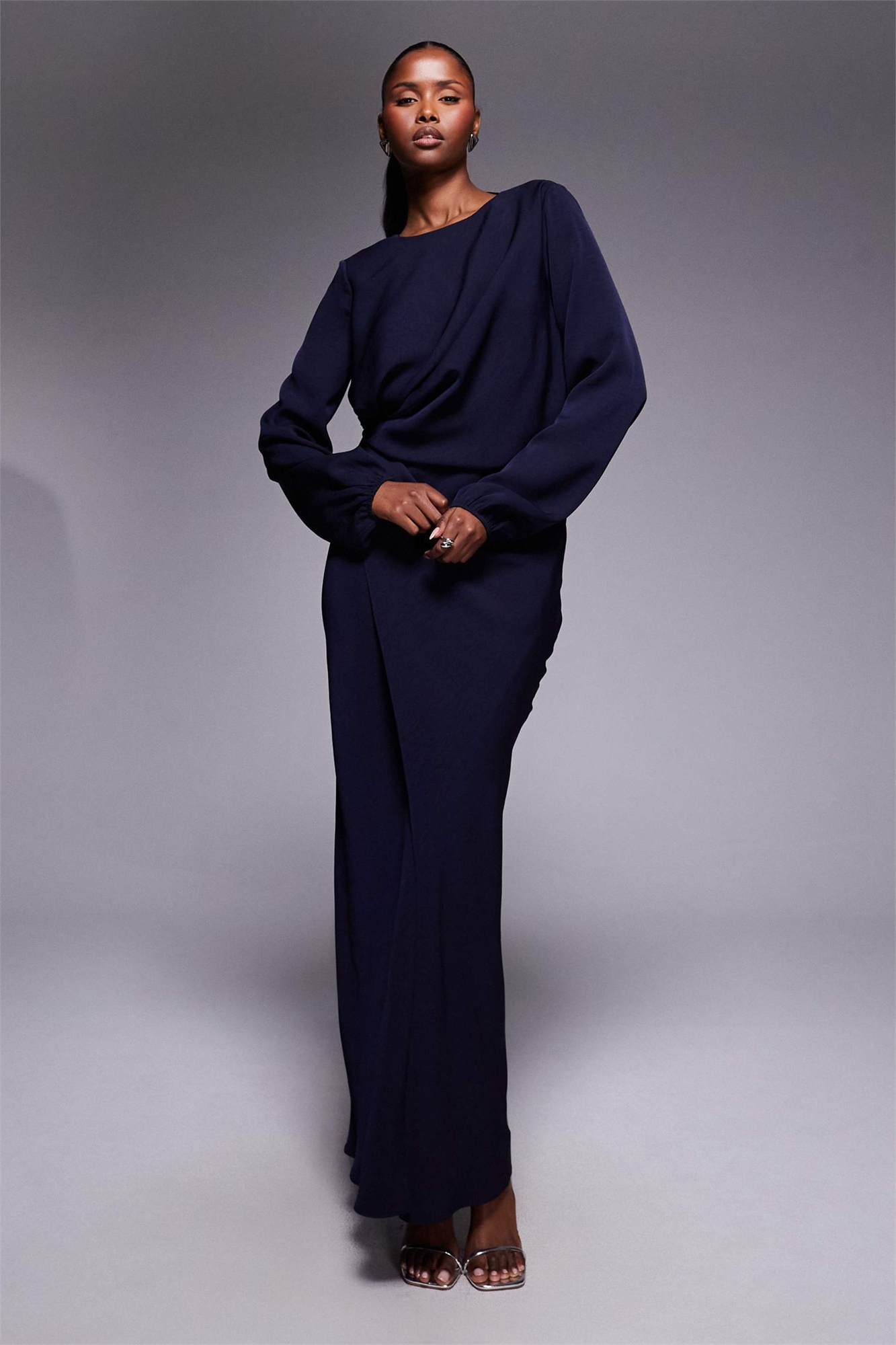 Макси-платье с длинными рукавами, закрученной талией и открытой спиной