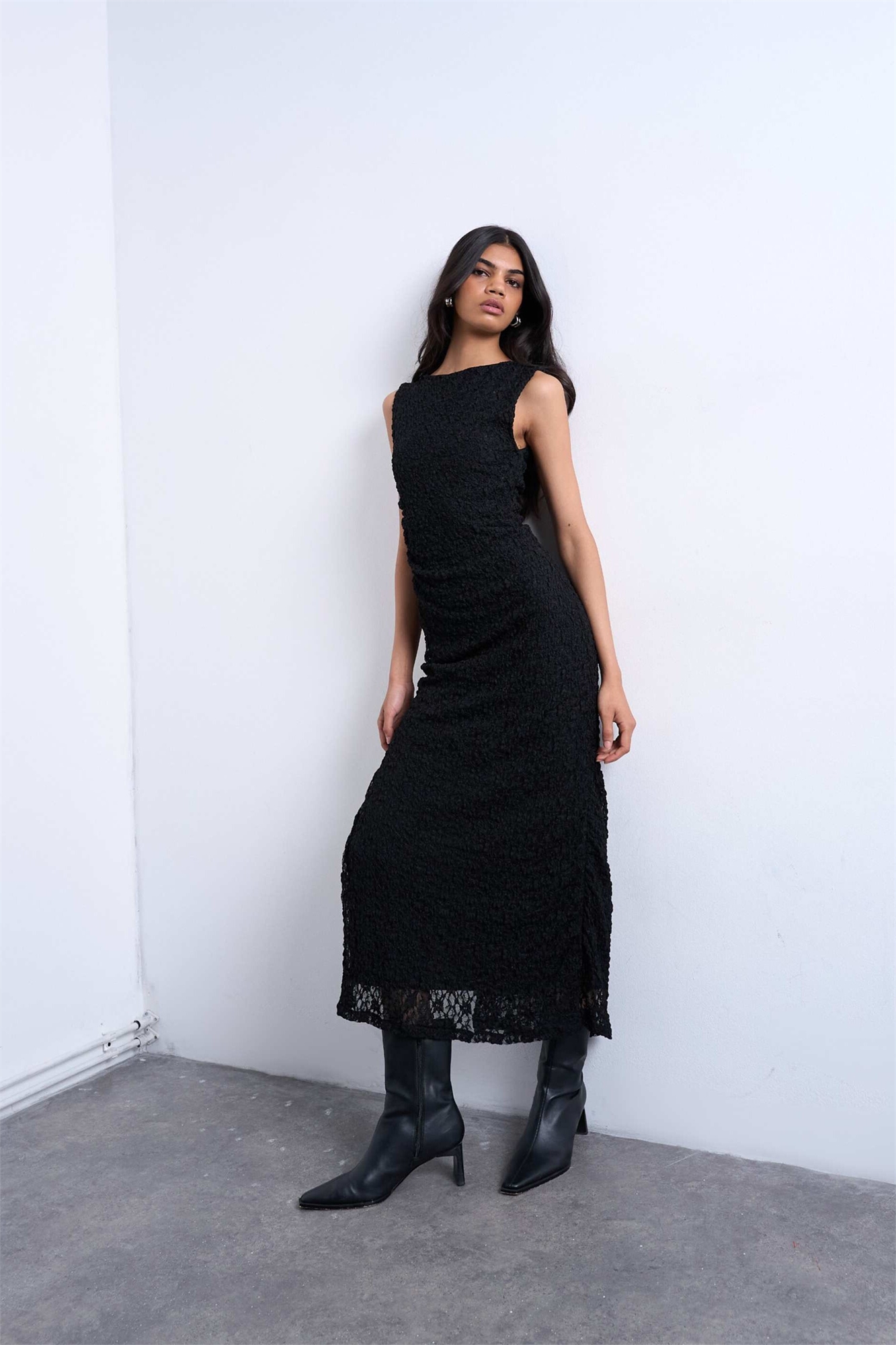 Макси-платье без рукавов с кружевом и боковым разрезом