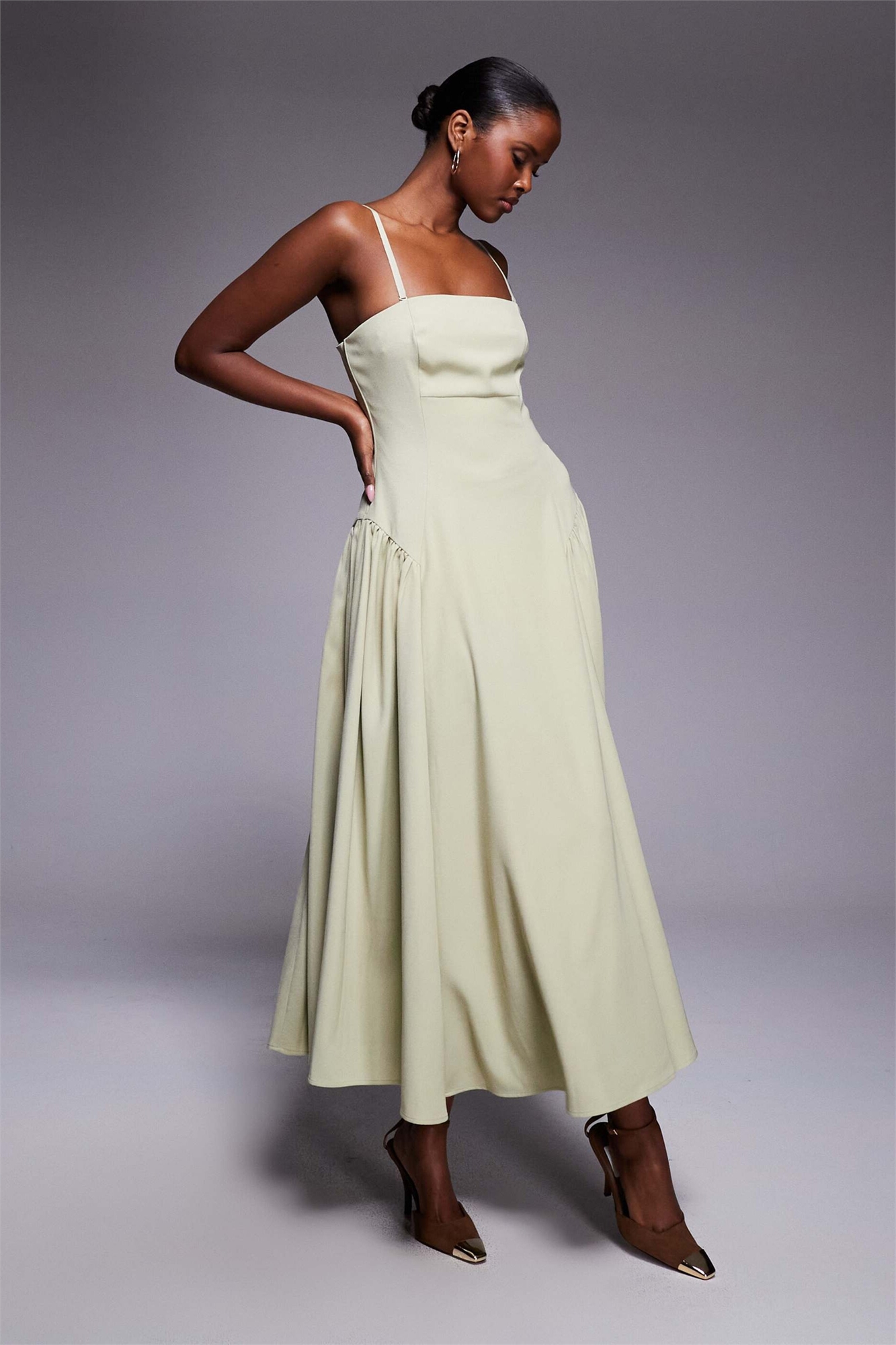 Лондонское платье средней длины с бандо и сборками на бедрах