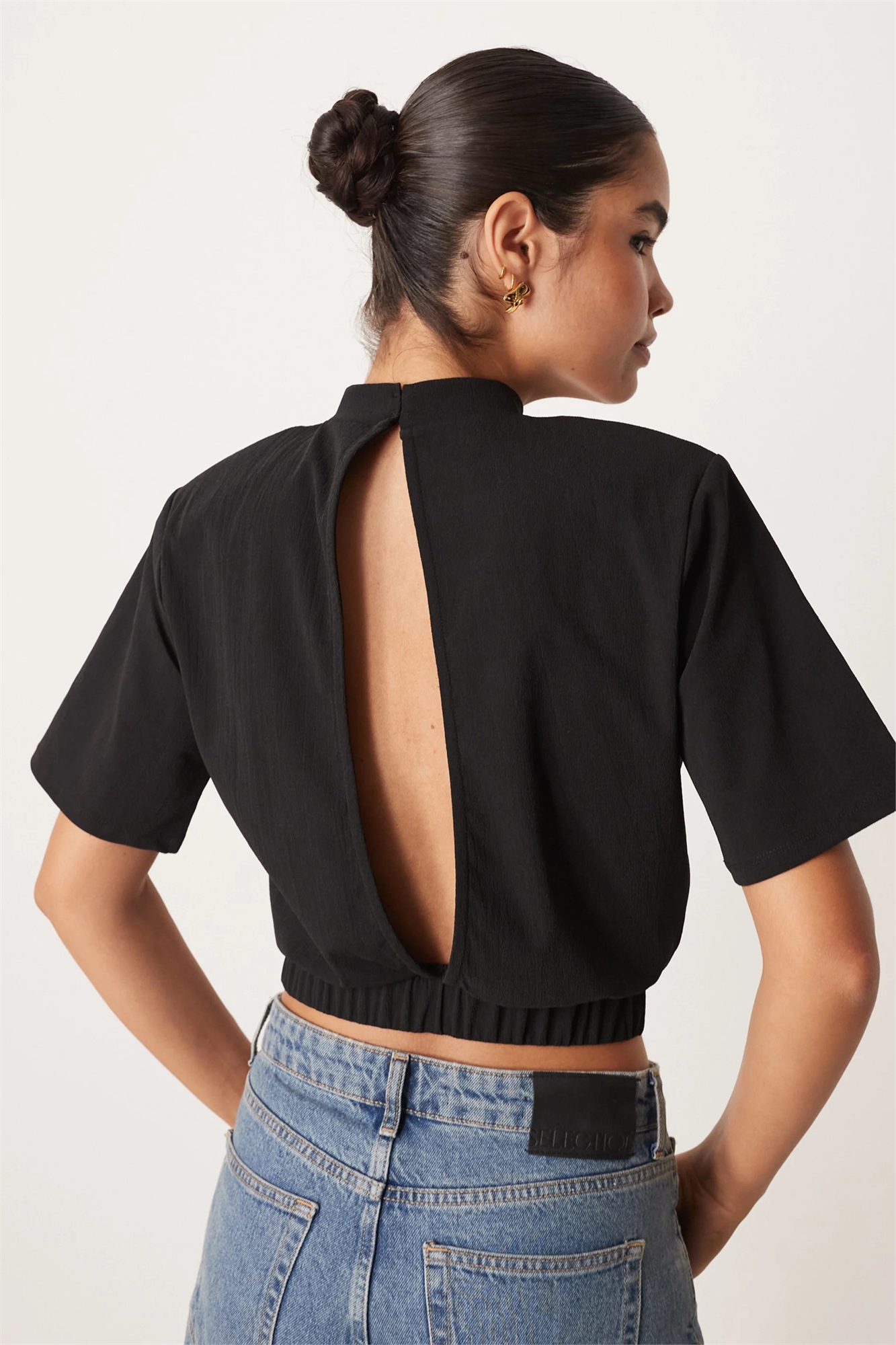 Короткая футболка с высоким воротником и плечевыми накладками