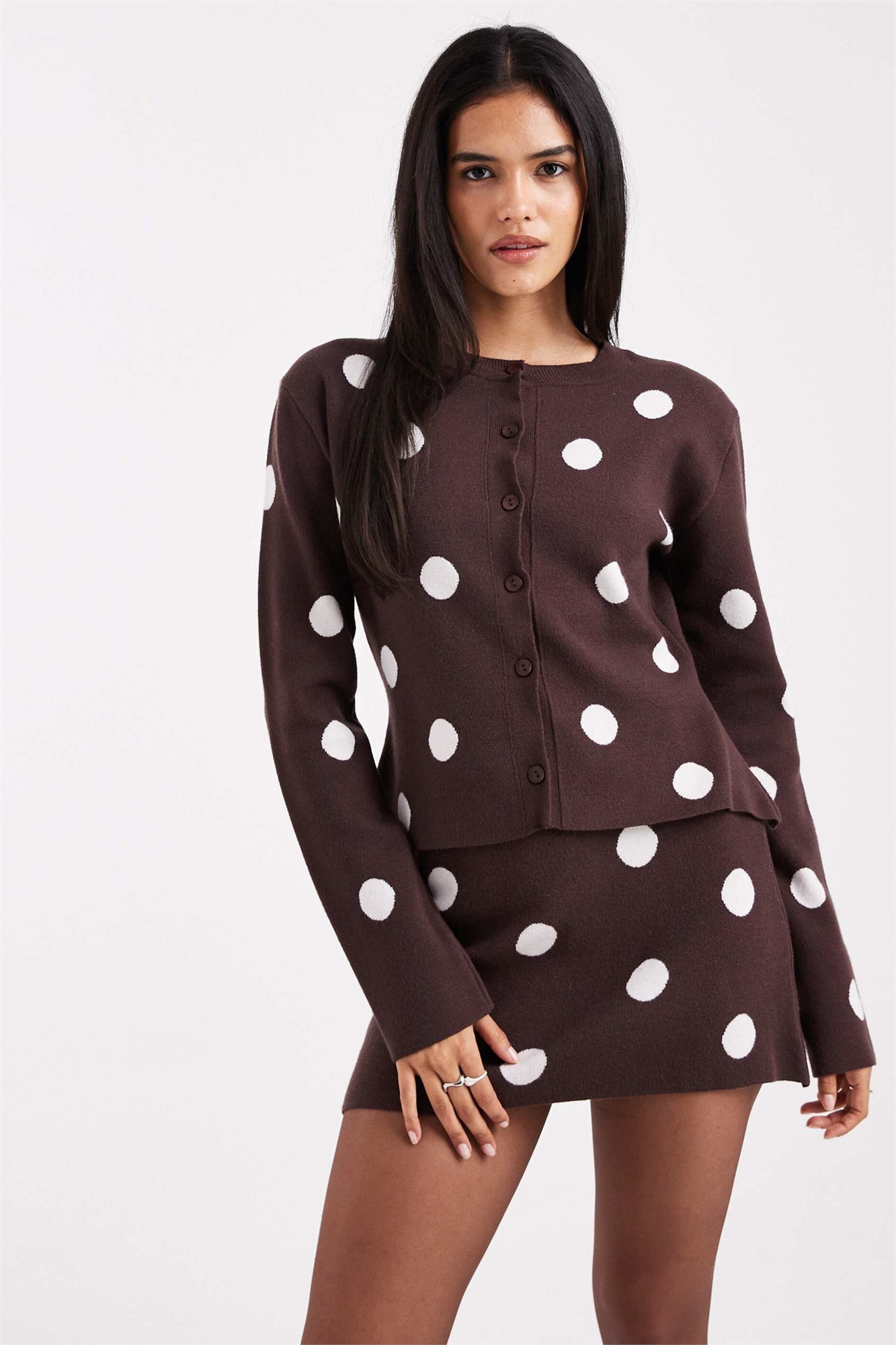 Комплект из тонкого вязаного кардигана и брюк в коричневую горошку