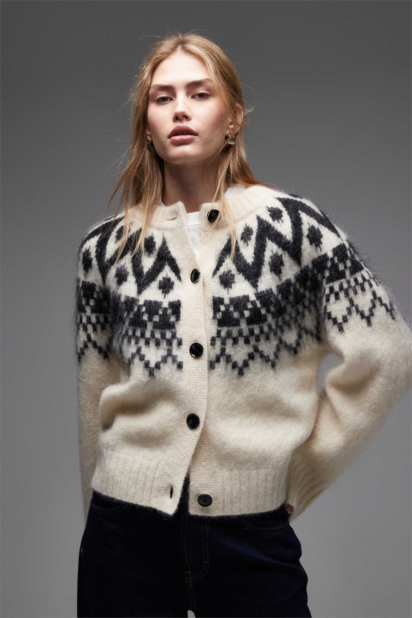 Кардиган с жаккардовым принтом из пушистой пряжи с добавлением шерсти и мохера в стиле «Фэр-Айл»