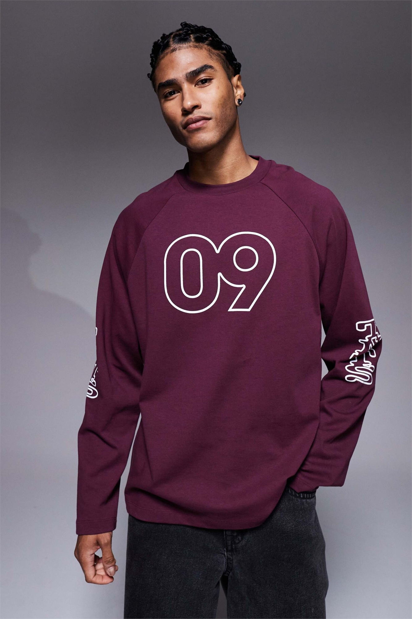 Футболка с длинными рукавами и рагланными вставками свободного кроя с флокированным спортивным рисунком