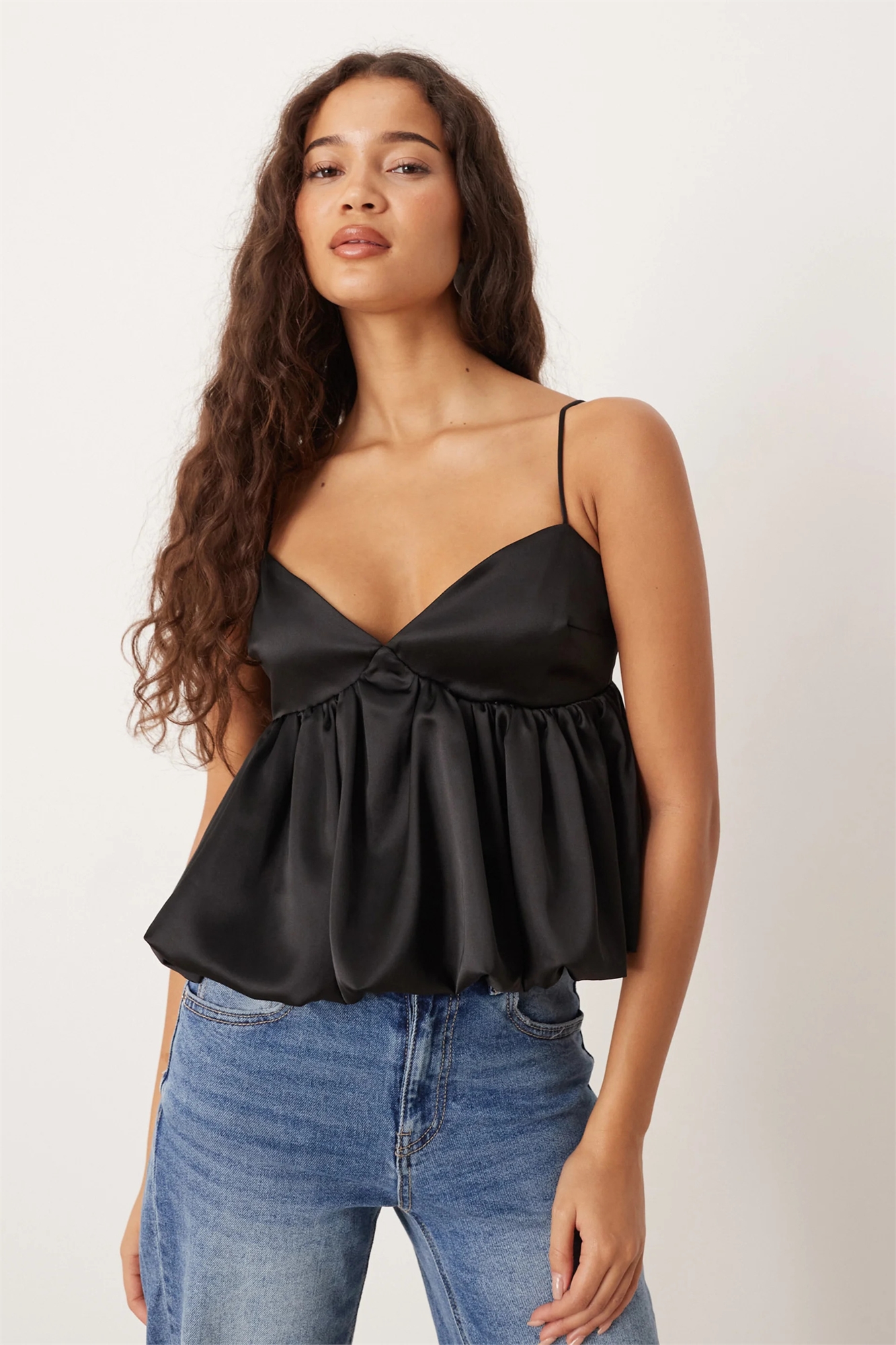 Ткань сатинового типа: блестящая, хорошо драпируемая и шелковисто-гладкая. Основной материал: 100% полиэстер, подкладка: 100% полиэстер.