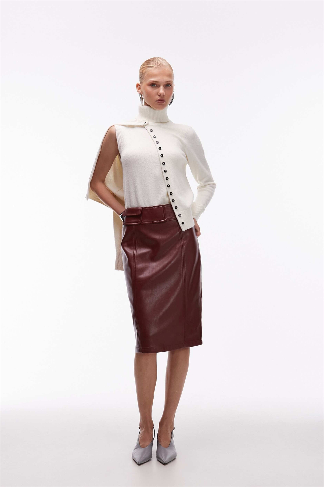 Юбка средней длины с карманом на поясе из искусственной кожи
