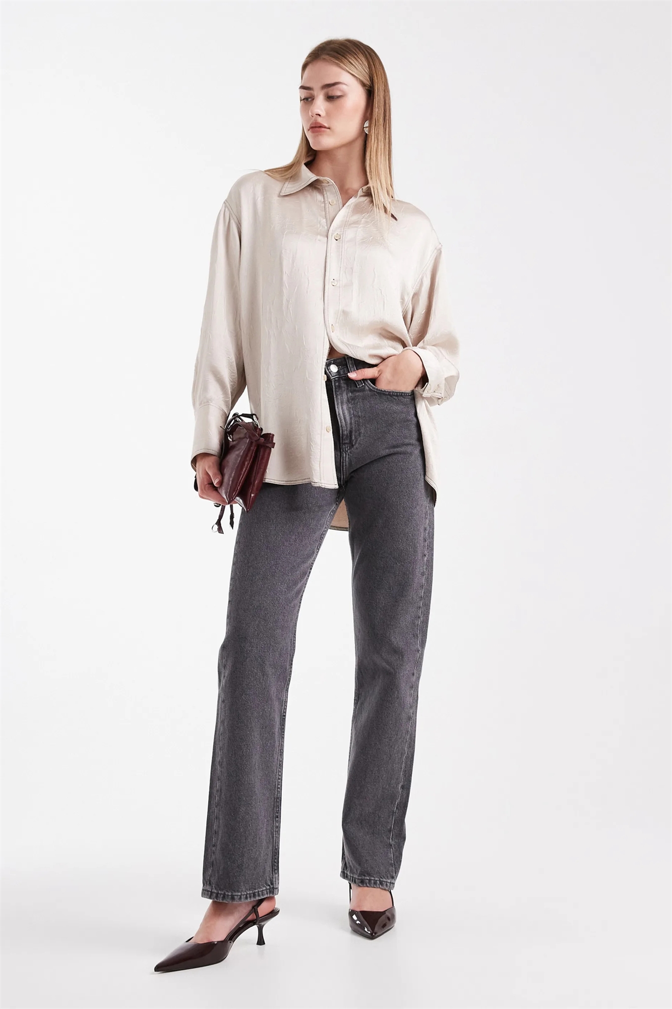 Рубашка-лонглайн из гофрированного атласа с контрастной строчкой
