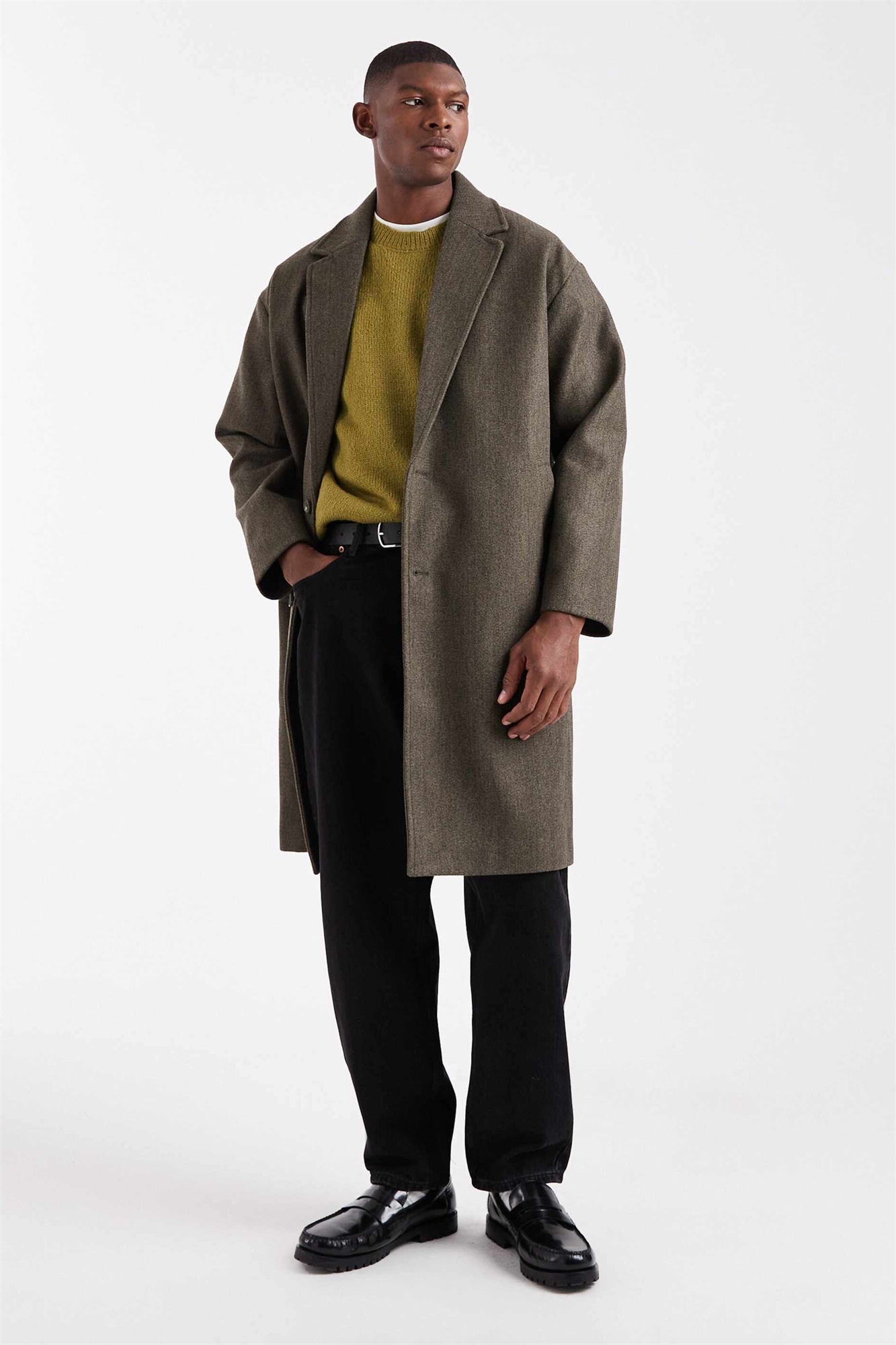 Пальто с заниженными плечами и удлиненным кроем