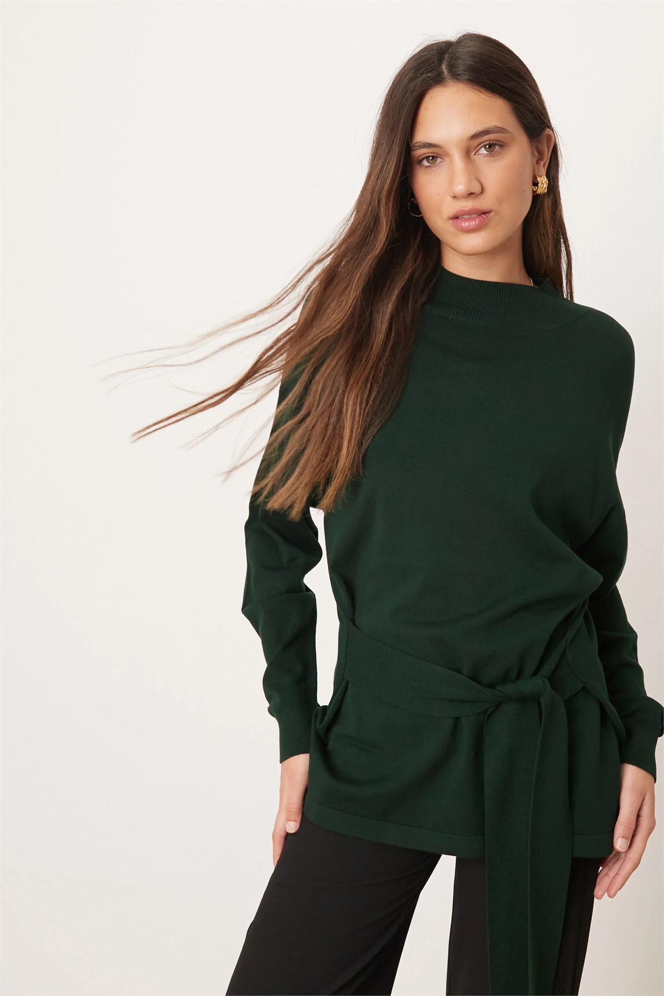Свитер с высоким воротником и завязками на талии