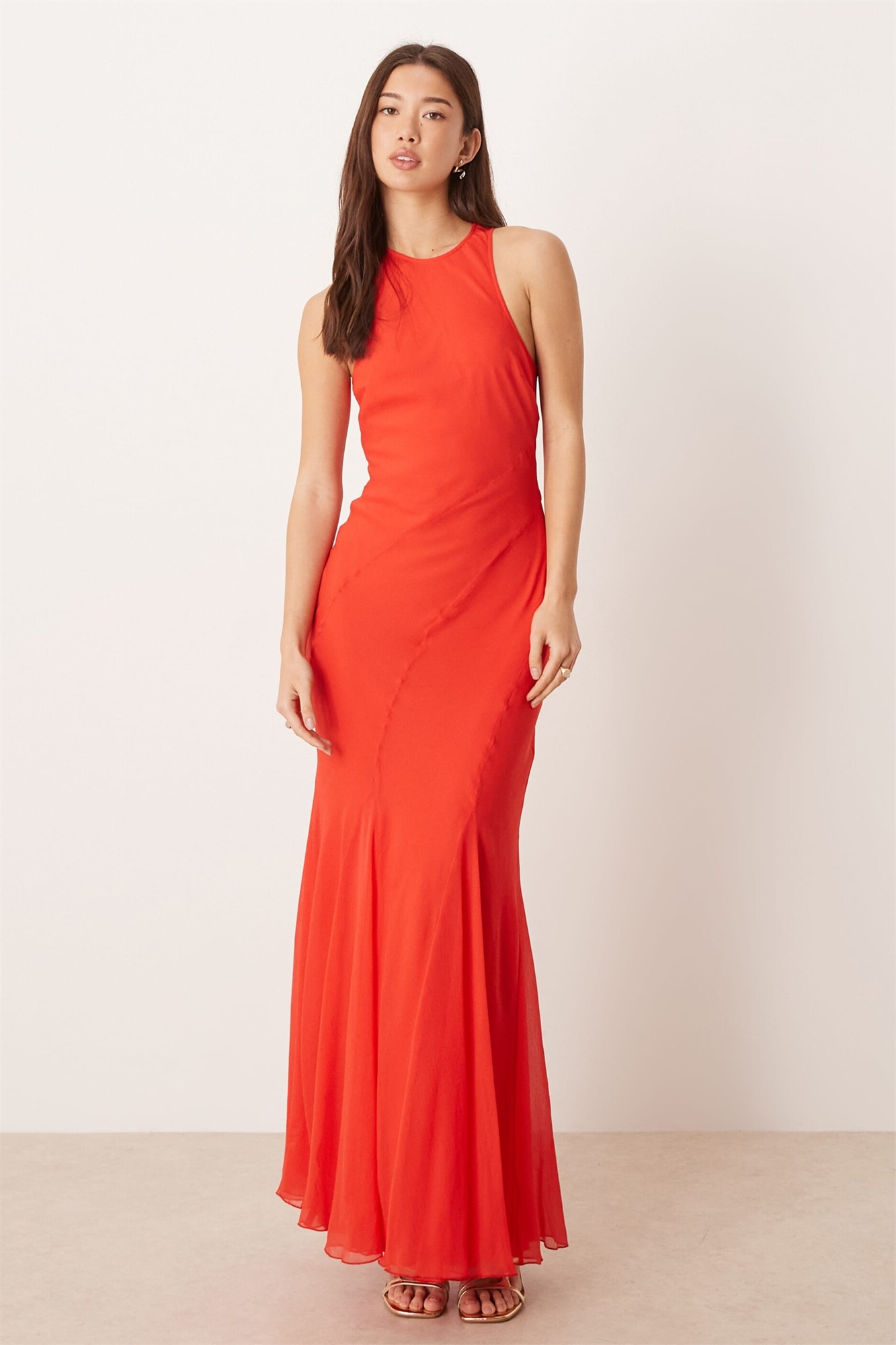 Макси-платье с косым вырезом и годетами по подолу