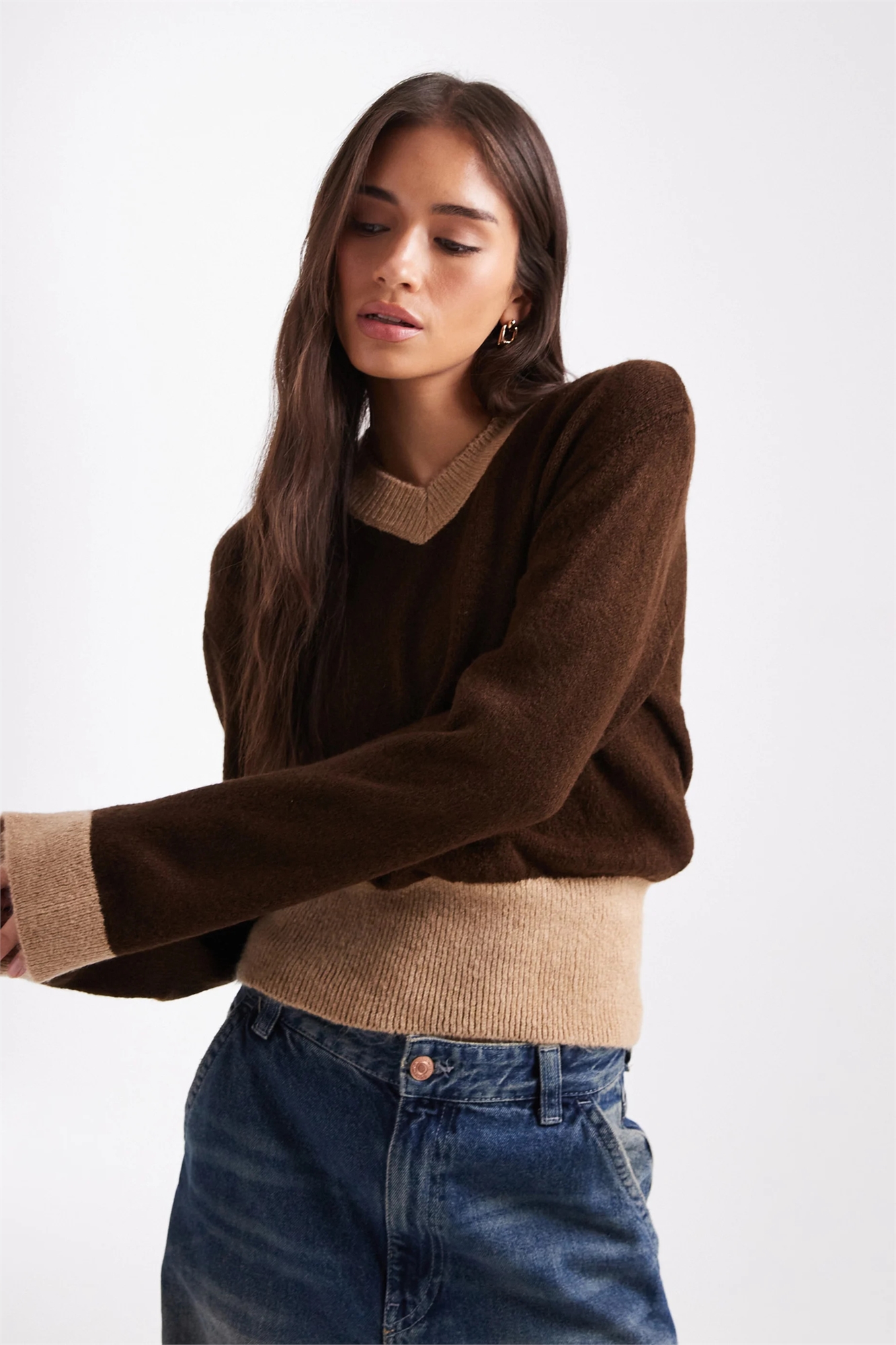 Вязаный свитер с высоким V-образным вырезом и контрастной ребристой отделкой