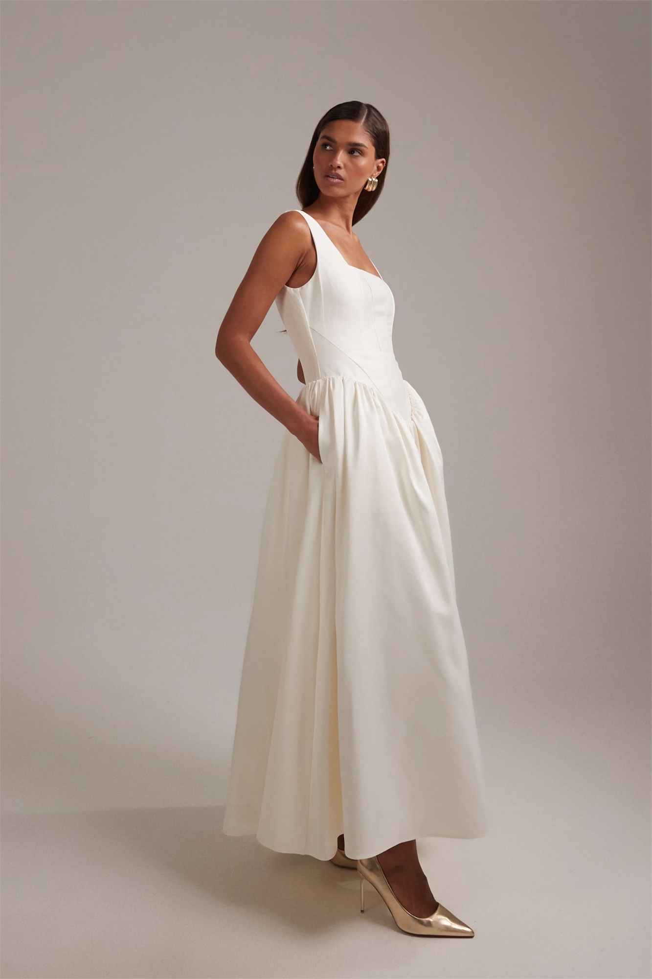 Свадебное платье средней длины с квадратным вырезом и пышной юбкой