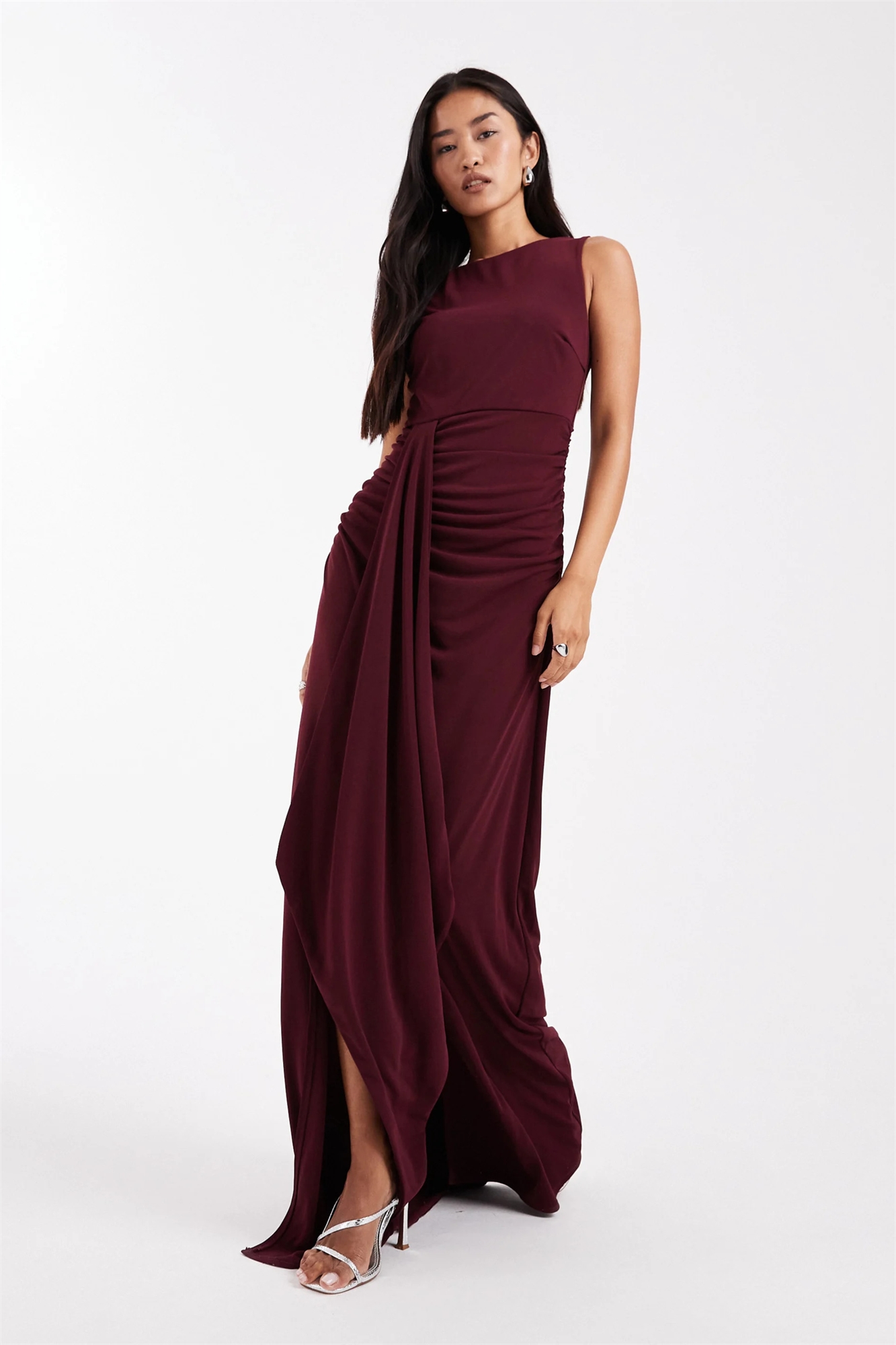 Макси-платье для подружек невесты с высоким воротником, без рукавов и сборками спереди