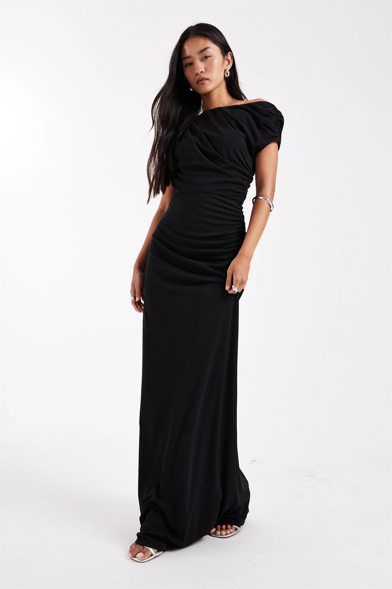 Макси-платье для подружек невесты с асимметричным вырезом на плече и рюшами