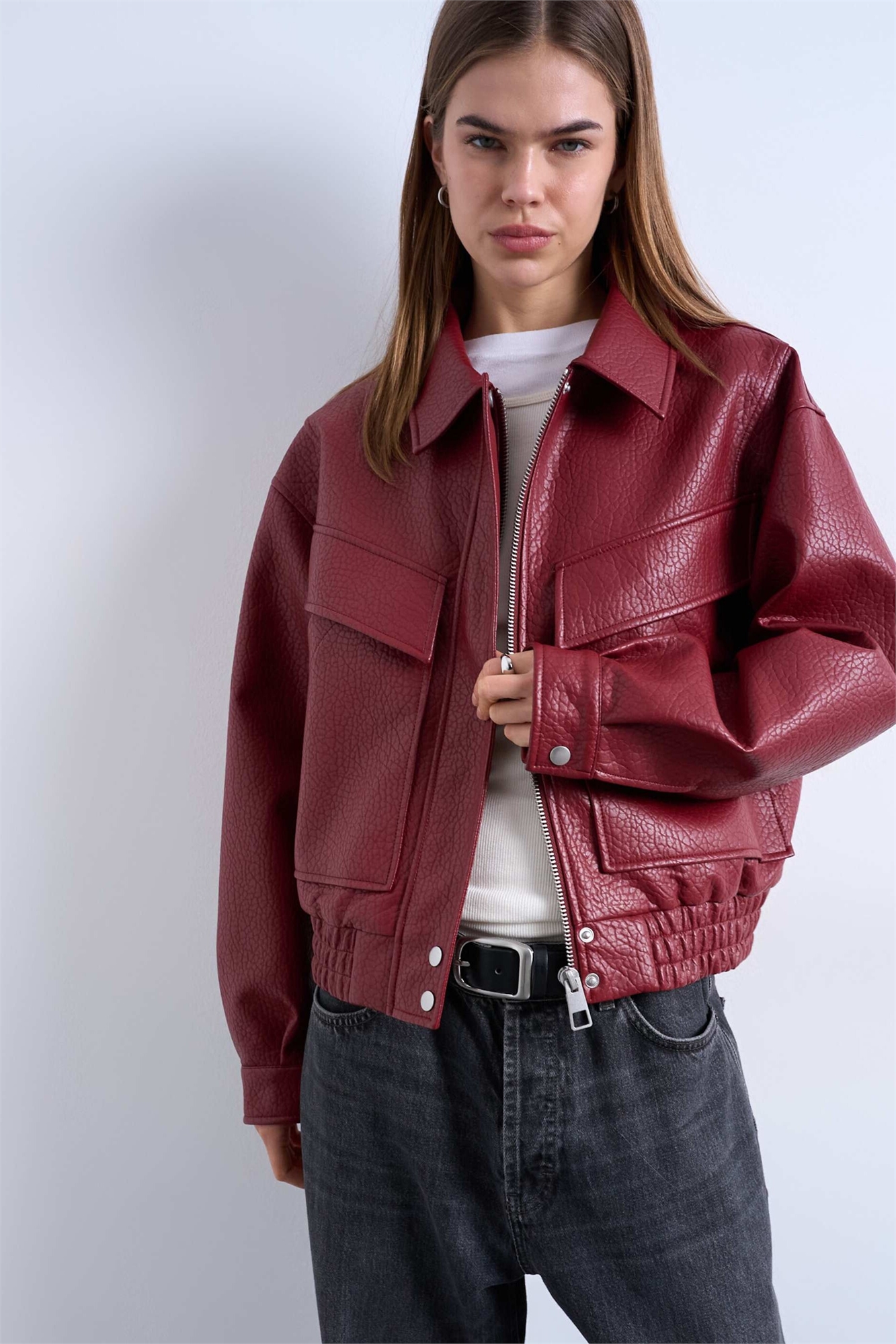 Бомбер из искусственной кожи с прямого кроя и карманами на молнии