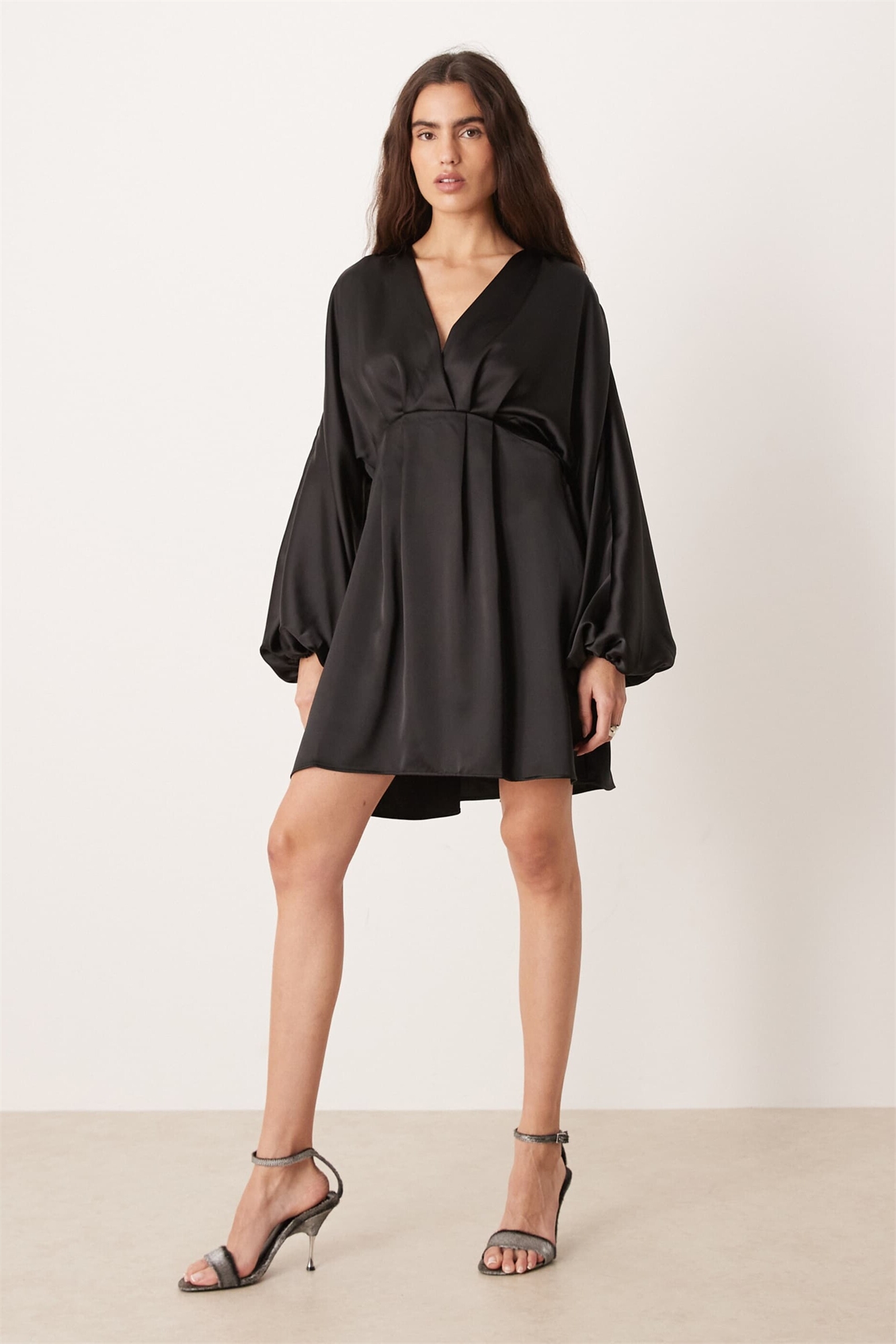 Мини-платье с V-образным вырезом, атласными рукавами «летучая мышь» и перекрещивающимся вырезом спереди