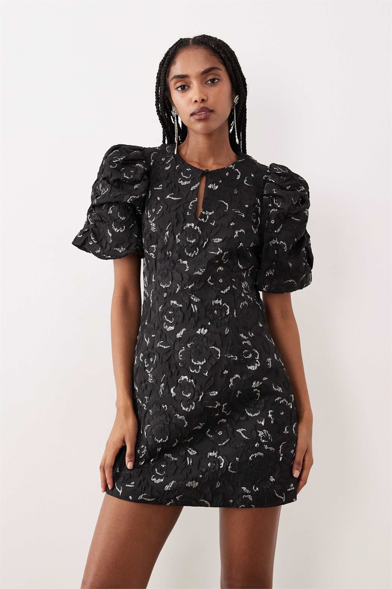 Мини-платье из розовой парчи с рукавами-балонами и серебристыми металлическими вставками