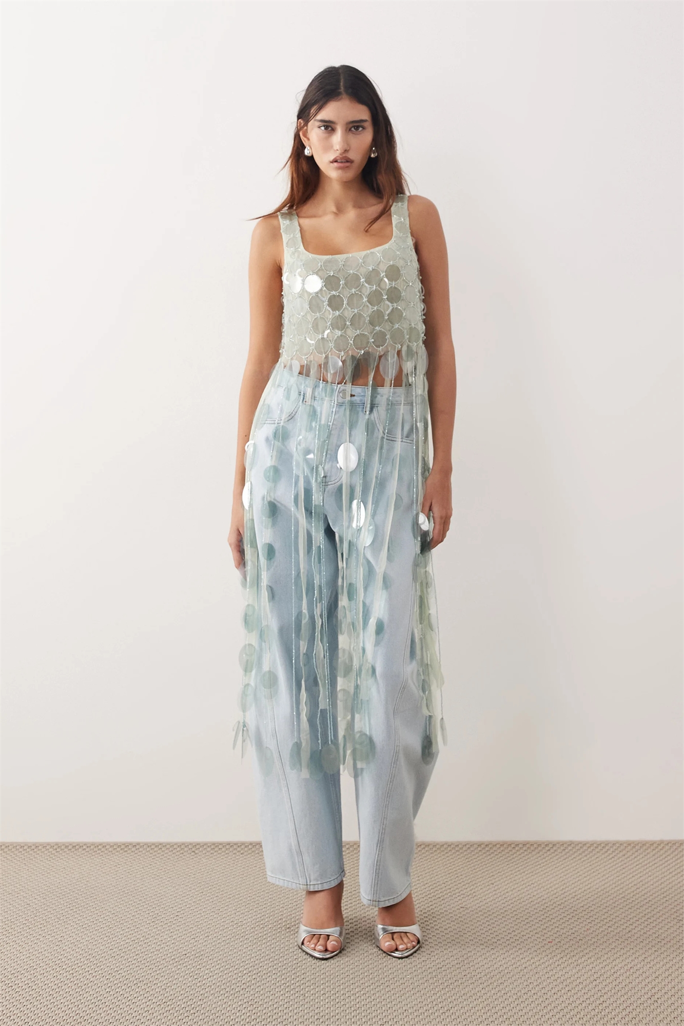Укороченный топ с пайетками в футуристическом стиле и длинной бахромой 3D по низу