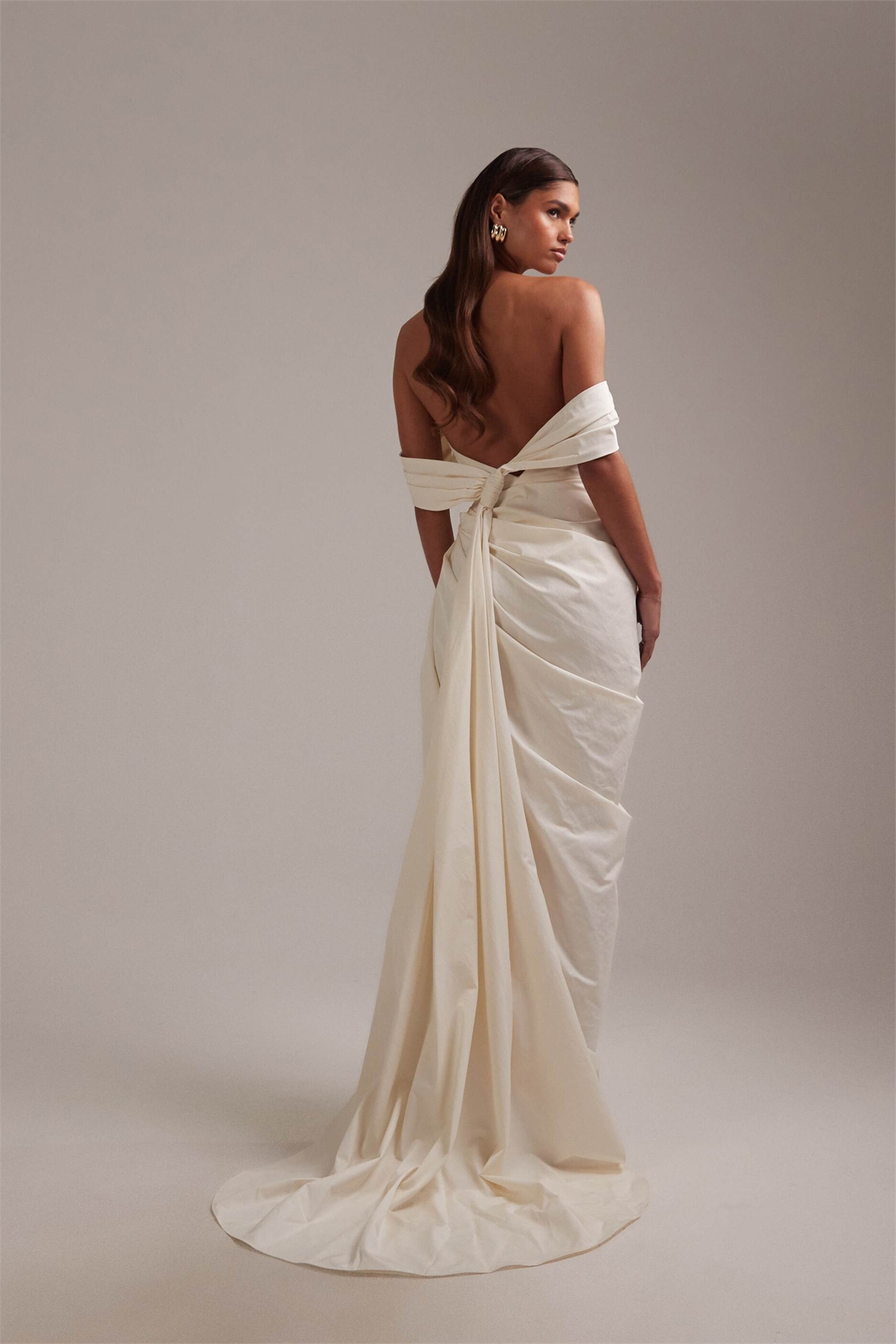 Свадебное платье макси из тафты с драпировкой, открытыми плечами и завязками сзади