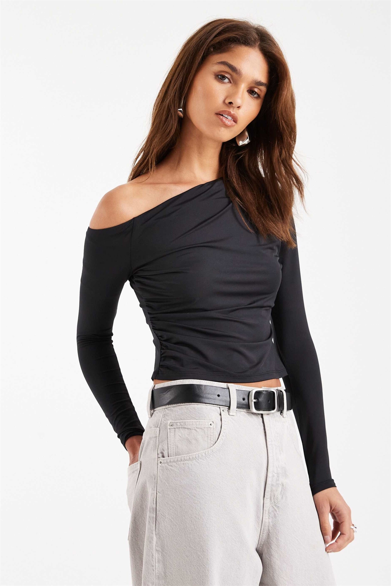 Облегающий топ с открытыми плечами, рюшами и длинными рукавами