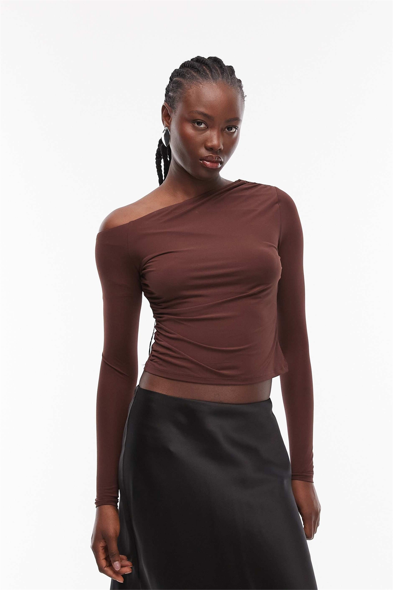 Облегающий топ с открытыми плечами, рюшами и длинными рукавами