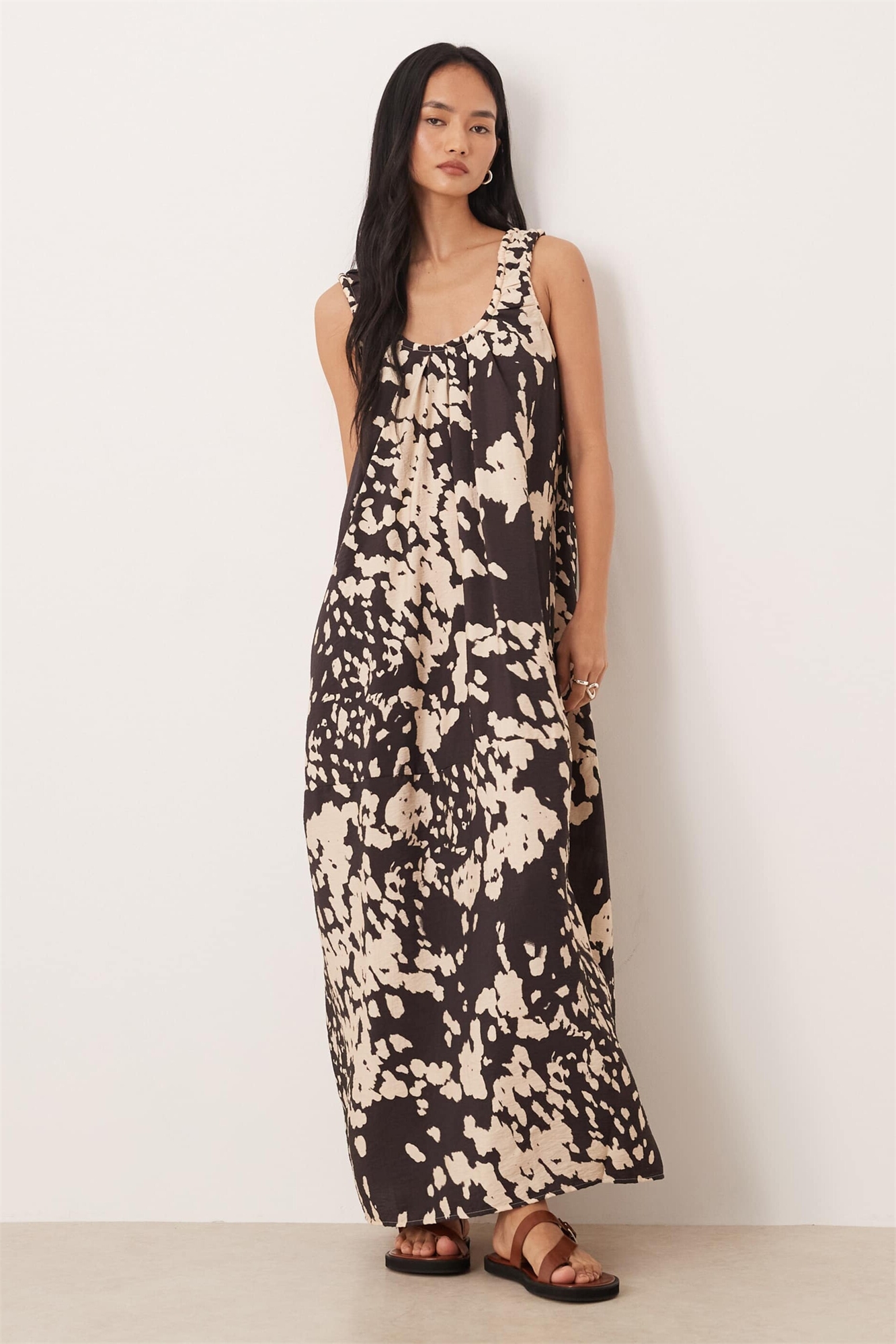 Макси-платье из технической ткани с вырезом и рюшами на горловине