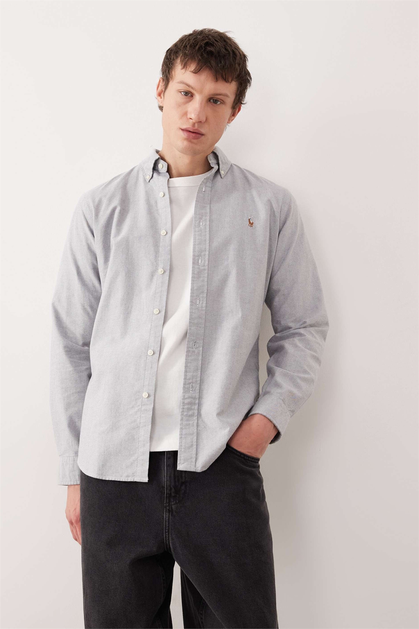 Рубашка оксфорд с логотипом в виде значка, индивидуальный крой, серый цвет