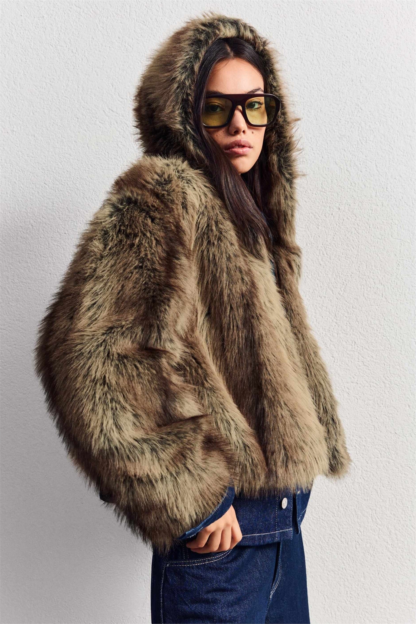 Куртка с капюшоном из искусственного меха коричневого цвета