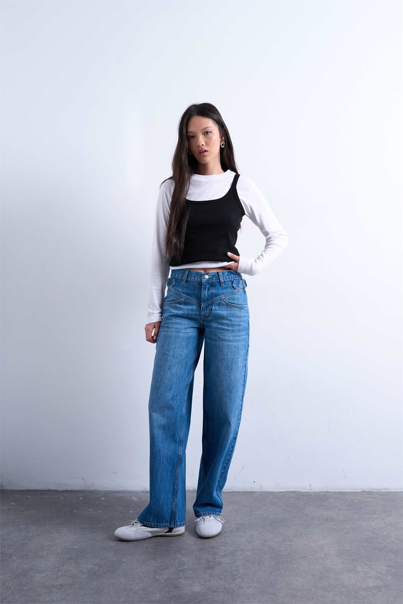 Джинсы со средней посадкой, кокеткой и затяжкой спереди