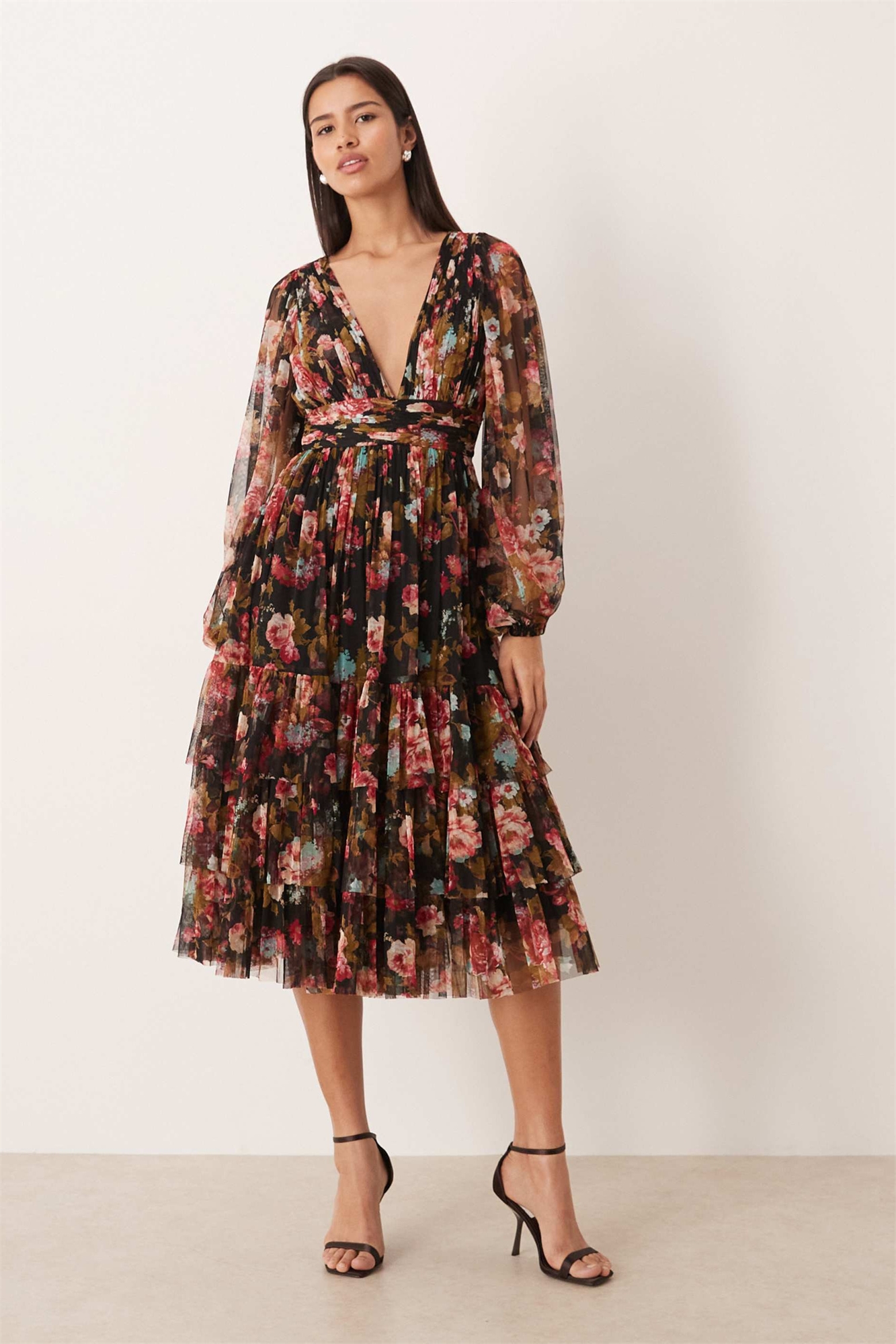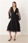 Платье средней длины из тюля с прозрачными рукавами-балонами, глубоким V-образным вырезом и многослойным силуэтом