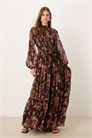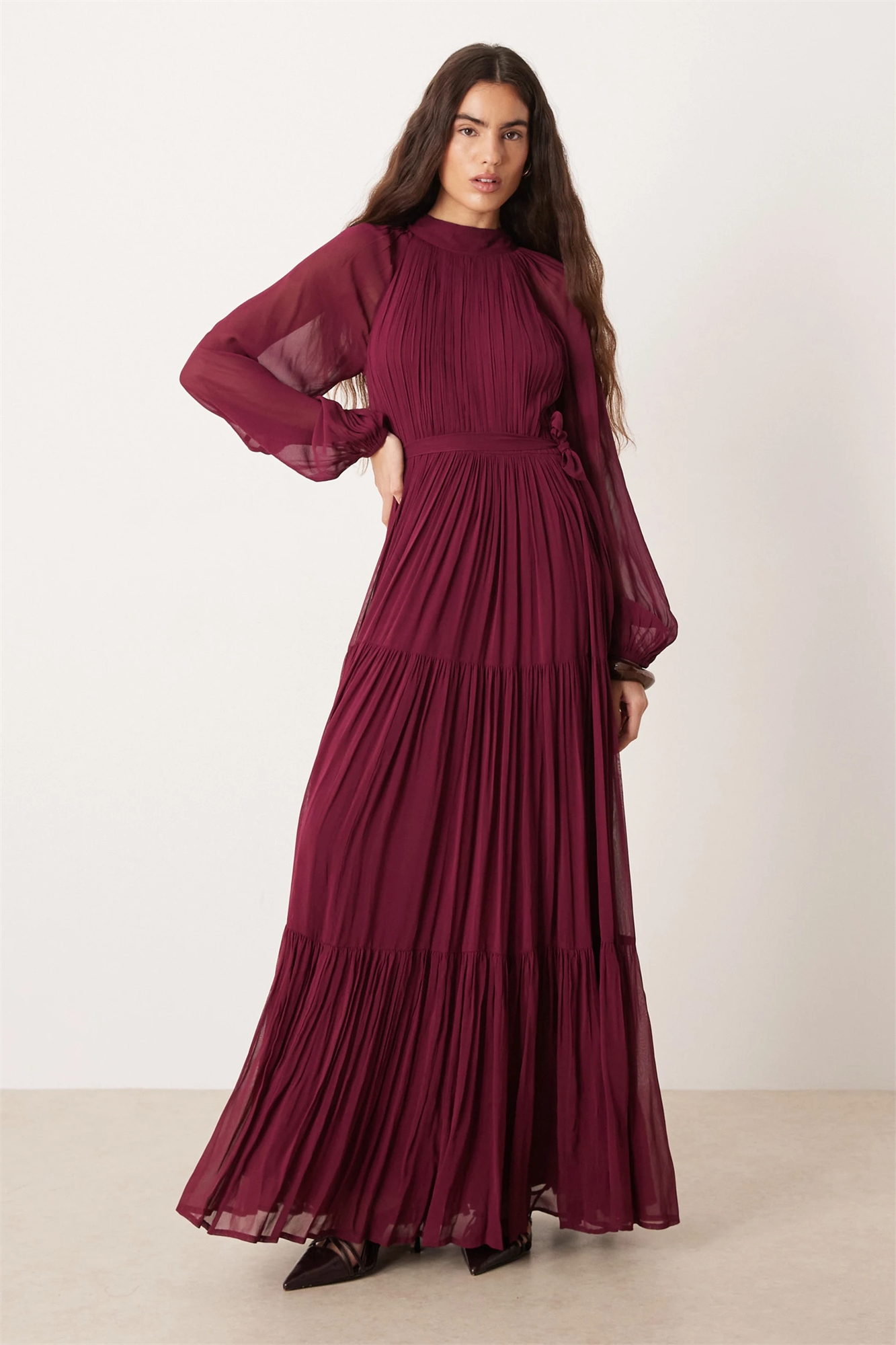 Макси-платье из шифона с рукавами-балонами, завязкой на талии, плиссировкой и многослойным кроем