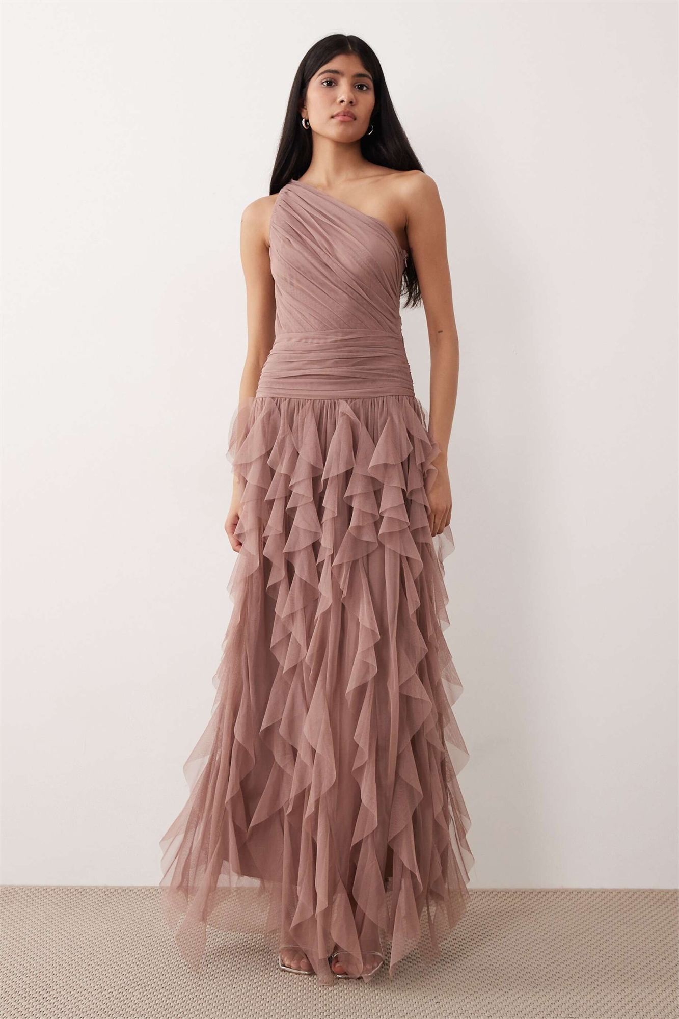 Макси-платье для подружки невесты из тюля с одним плечом, воланами и водопадным силуэтом