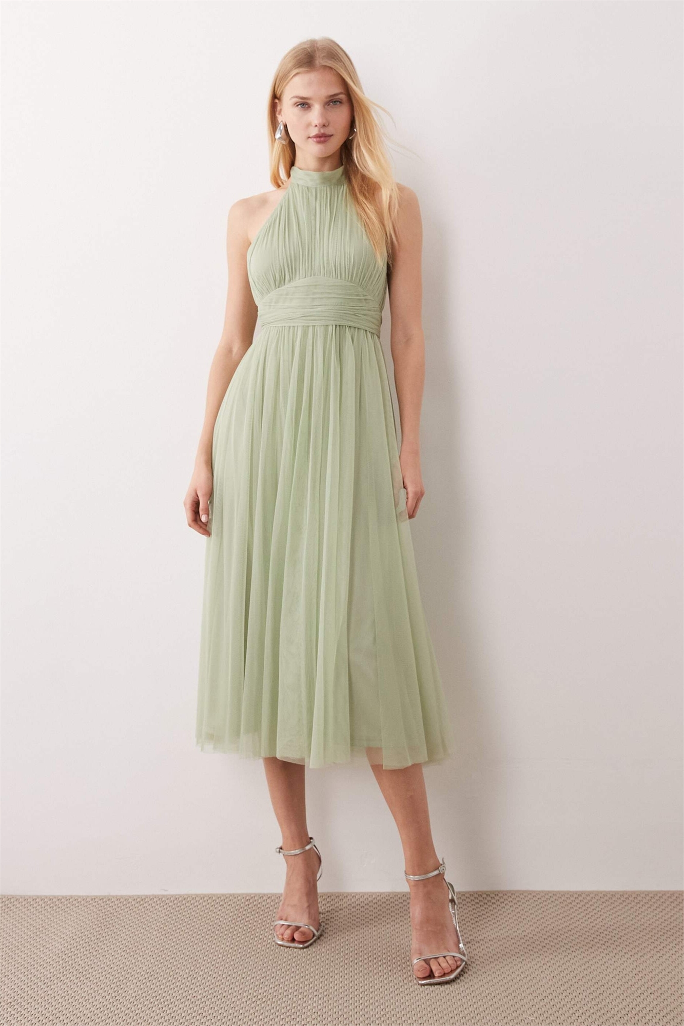 Платье средней длины из тюля с завязками на шее для подружки невесты