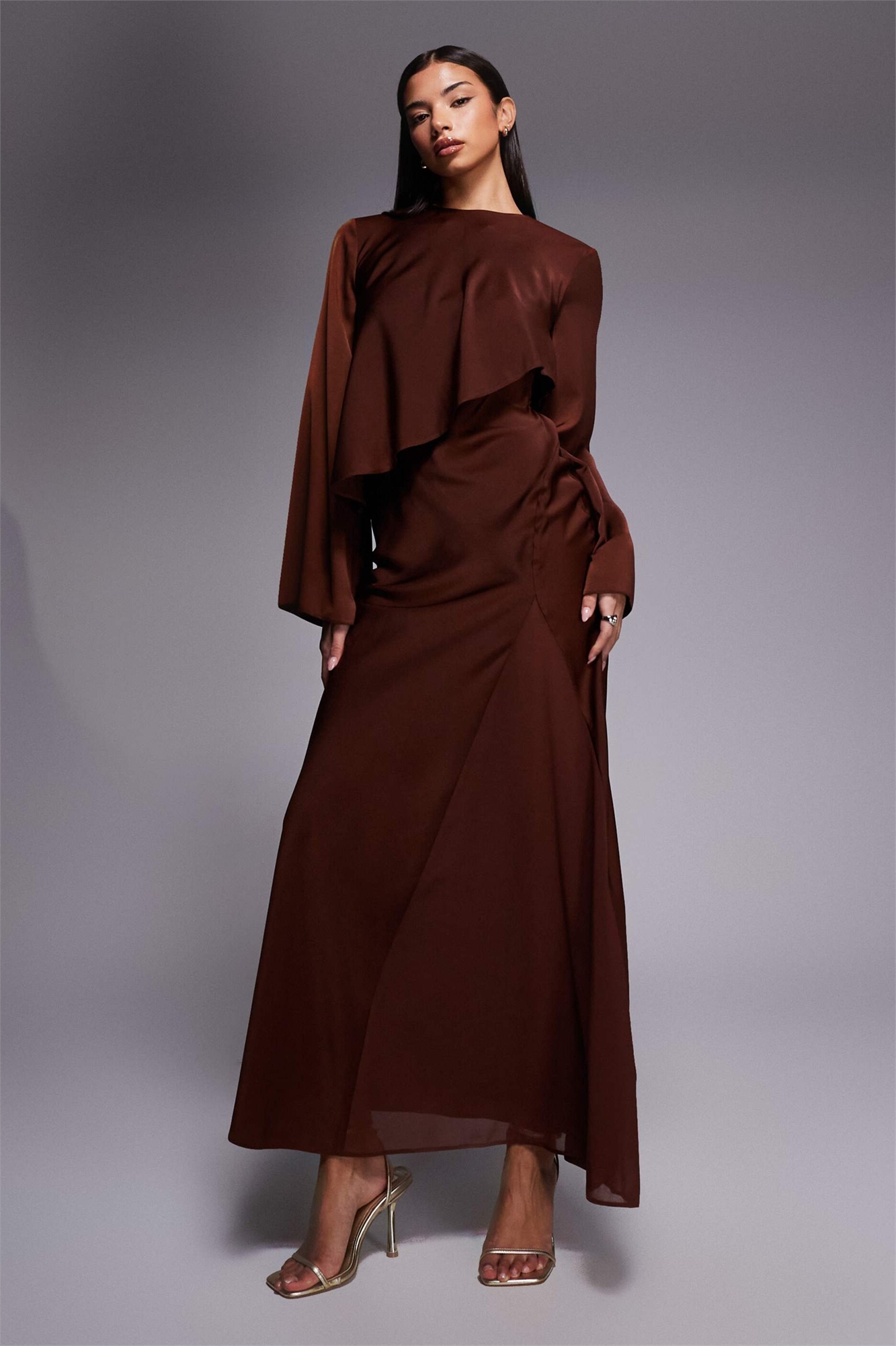 Макси-платье с атласными вставками в виде накидки с длинными рукавами
