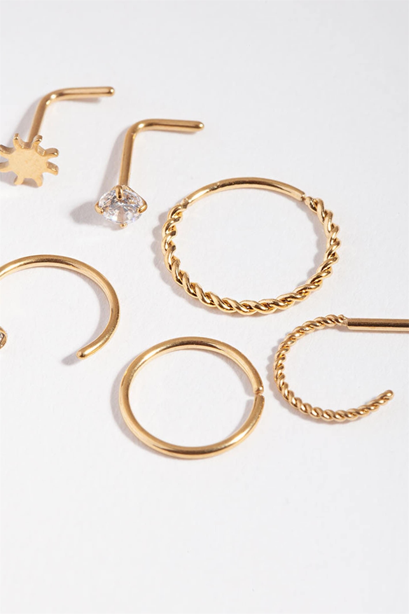 Набор из 6 золотых колец для носа из хирургической стали с золотым узором «солнечные лучи» и стразами