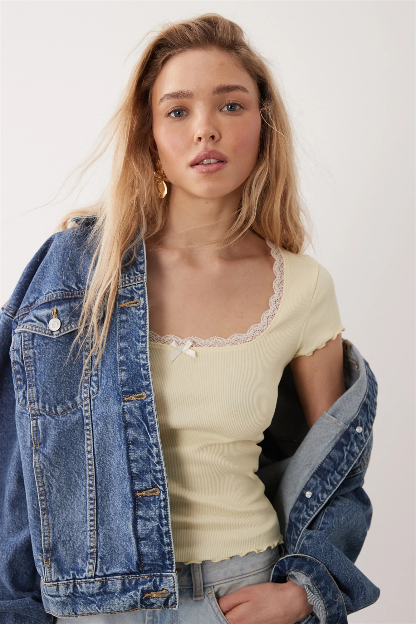 Топ с квадратным вырезом, кружевной отделкой и короткими рукавами