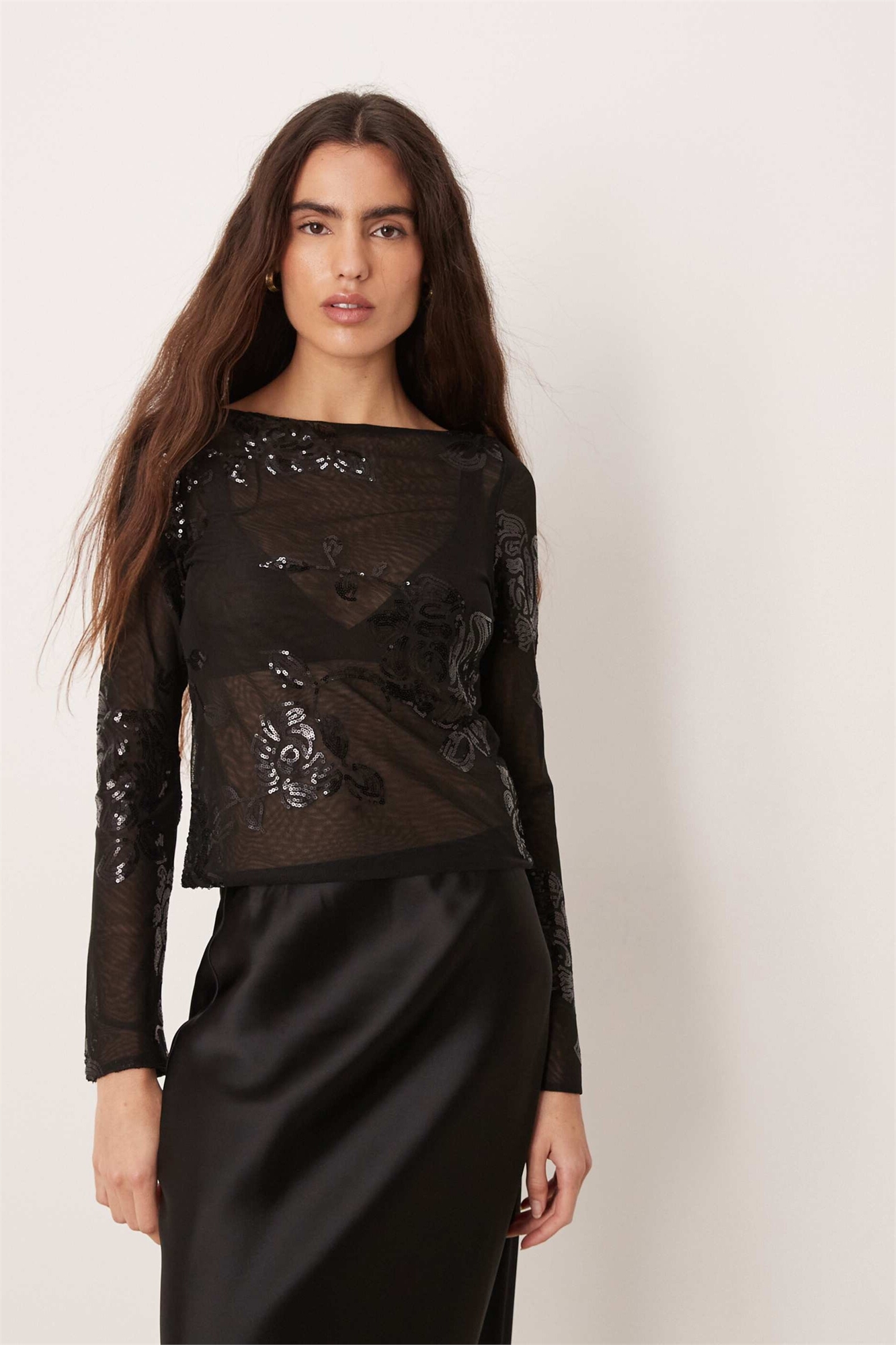Топ с длинными рукавами и цветочным принтом из пайеток