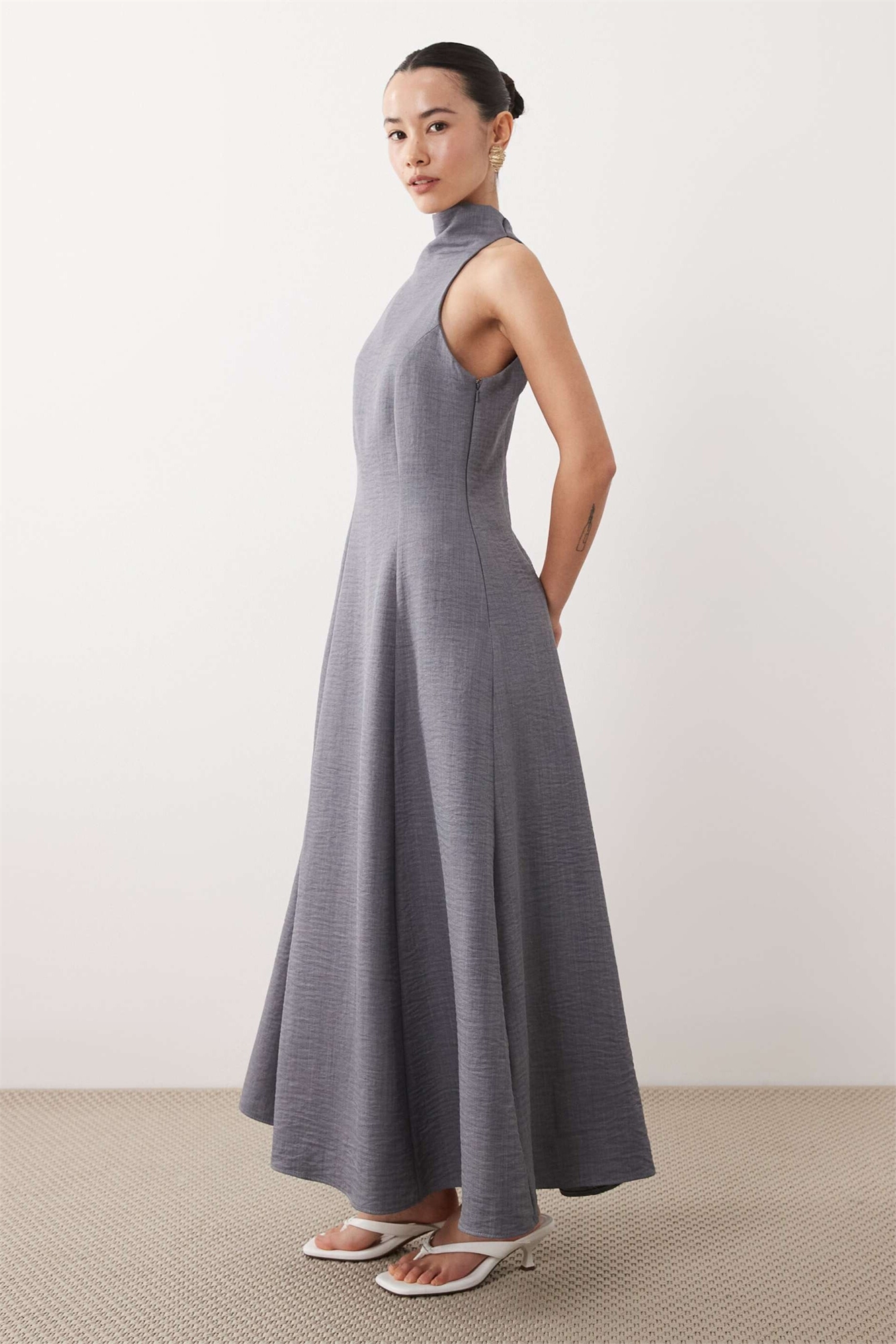 ASOS DESIGN Макси-платье с высоким воротником и открытыми плечами, имитирующее лен, для миниатюрных