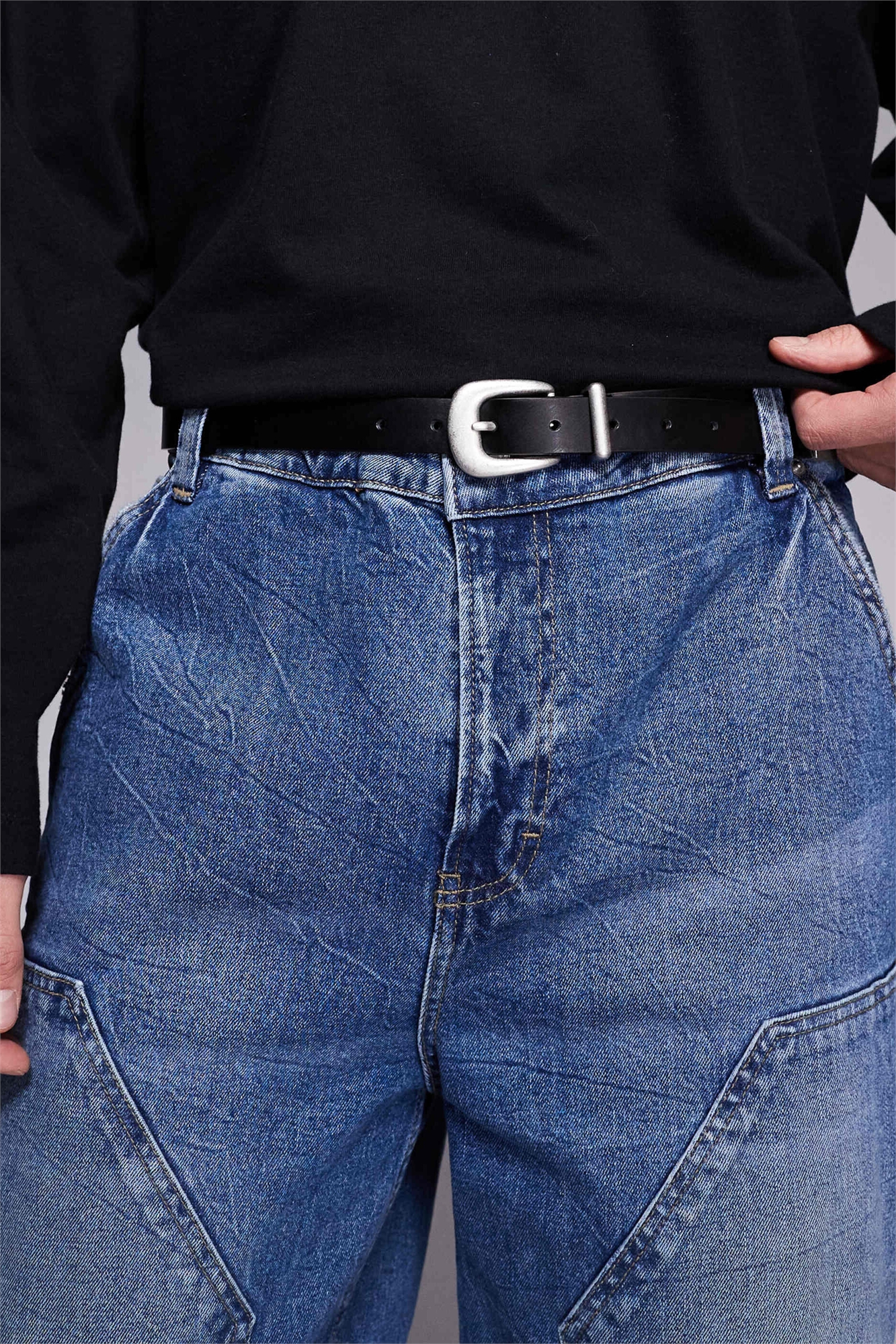 Тонкий ремень с изогнутой пряжкой и металлическим наконечником