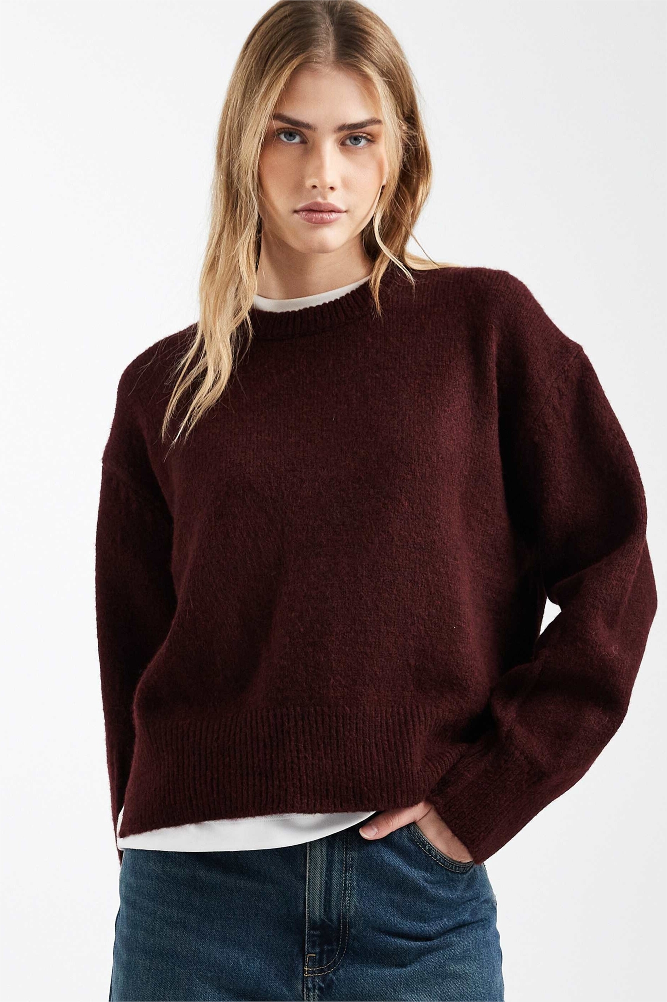 Свободный свитер с круглым вырезом и разрезами по бокам